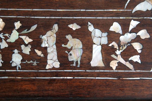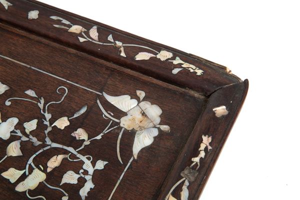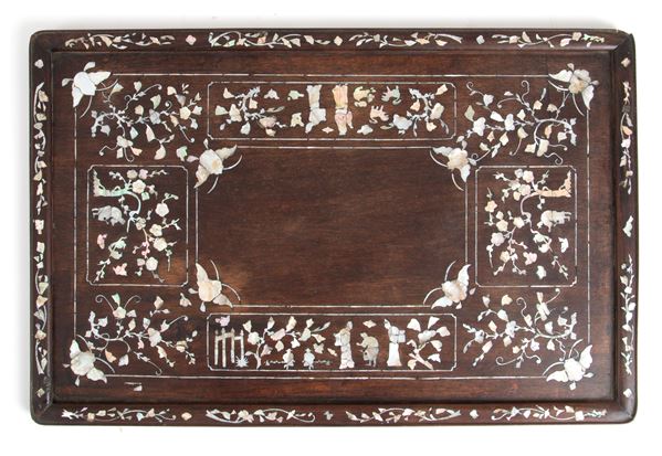 Vassoio in legno intarsiato in madreperla con scene di vita orientale. Cina. Lievi difetti.