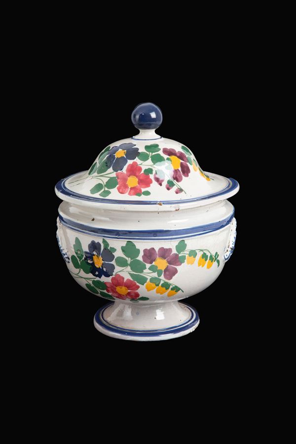 Zuppiera in maiolica decorata a motivi floreali. XIX secolo. Difetti di cottura.