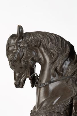 Scultura in bronzo raffigurante "ARABO A CAVALLO". Firmata e con marchio della fonderia alla base. Supporto in legno a finto marmo.