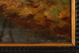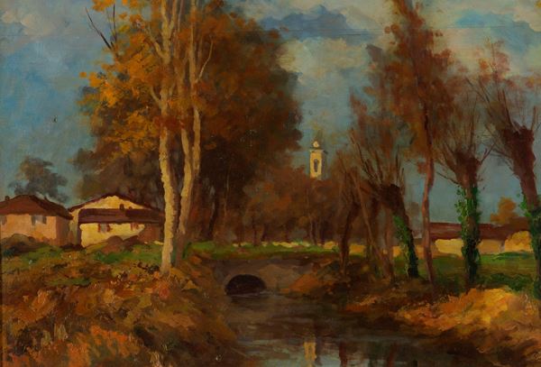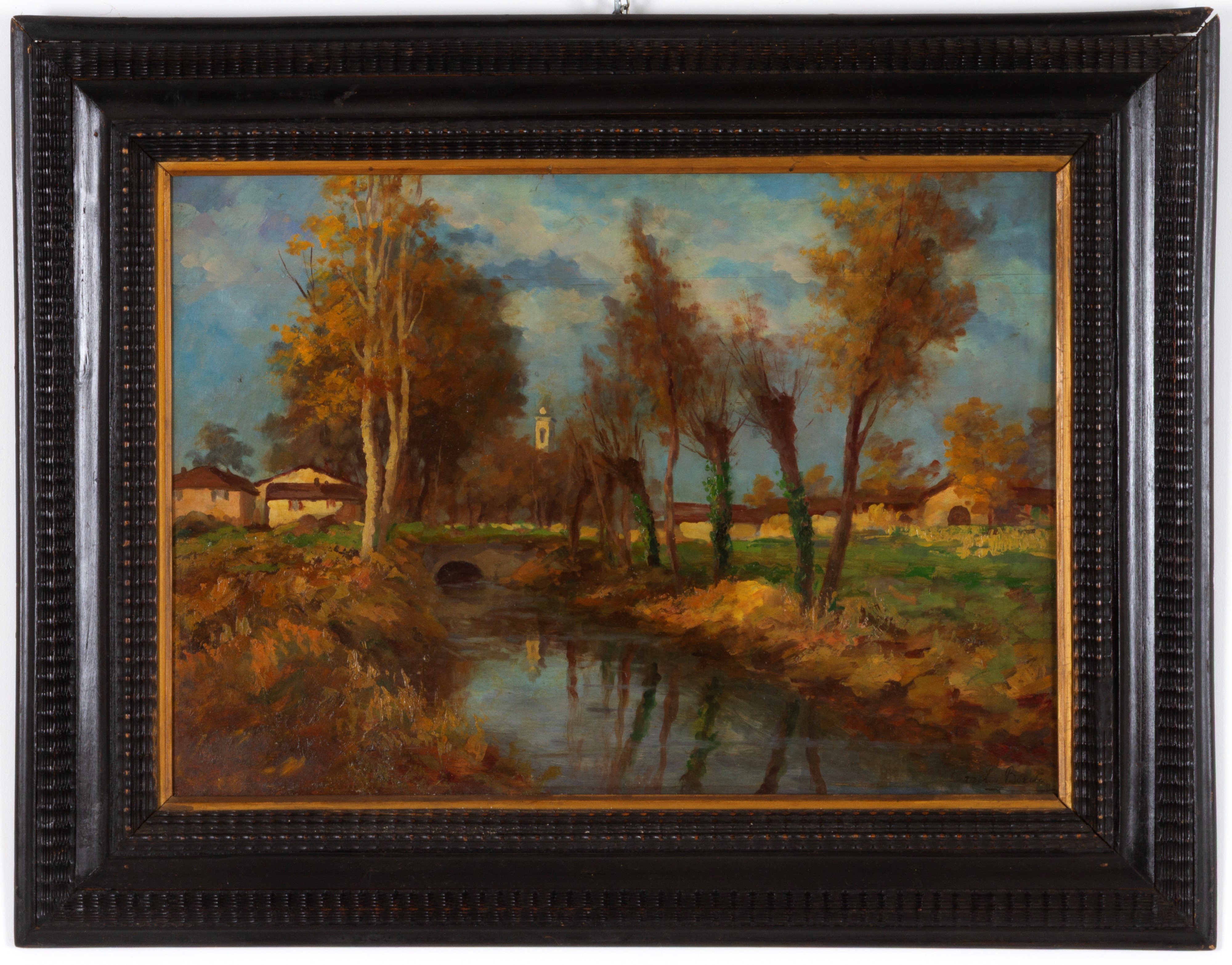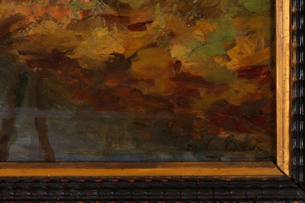 Dipinto olio su tavoletta raffigurante "PAESAGGIO FLUVIALE". Firmato in basso a destra. In cornice in legno.