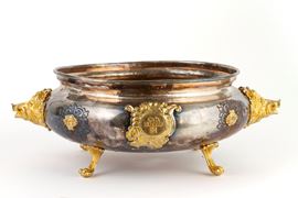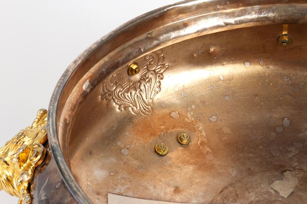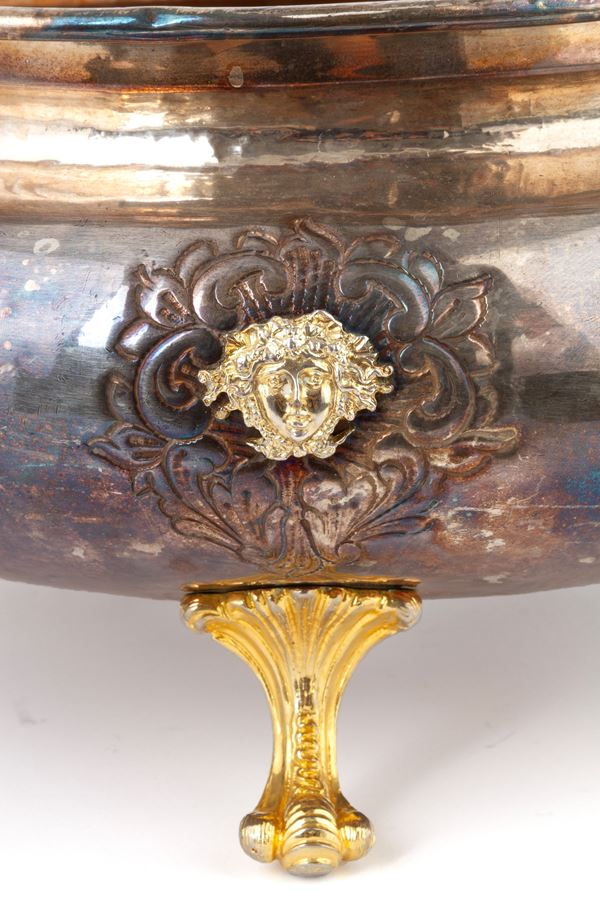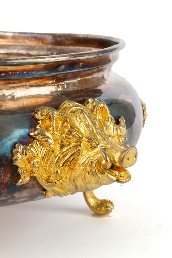 Cachepot in metallo argentato e dorato con manici a forma di cinghiale. Marcato IL FORNO DI BRERA PER CIGAS HOTEL sul fondo. XX secolo. Segni di usura del tempo.