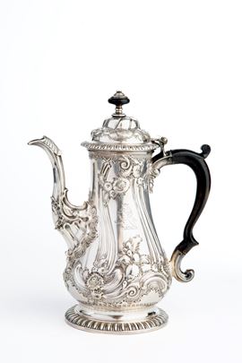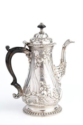 Caffettiera in argento con manico in legno, gr. 980 ca. Punzoni sul lato e sul fondo. Londra. Periodo Giorgio II.