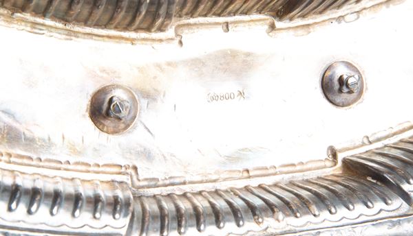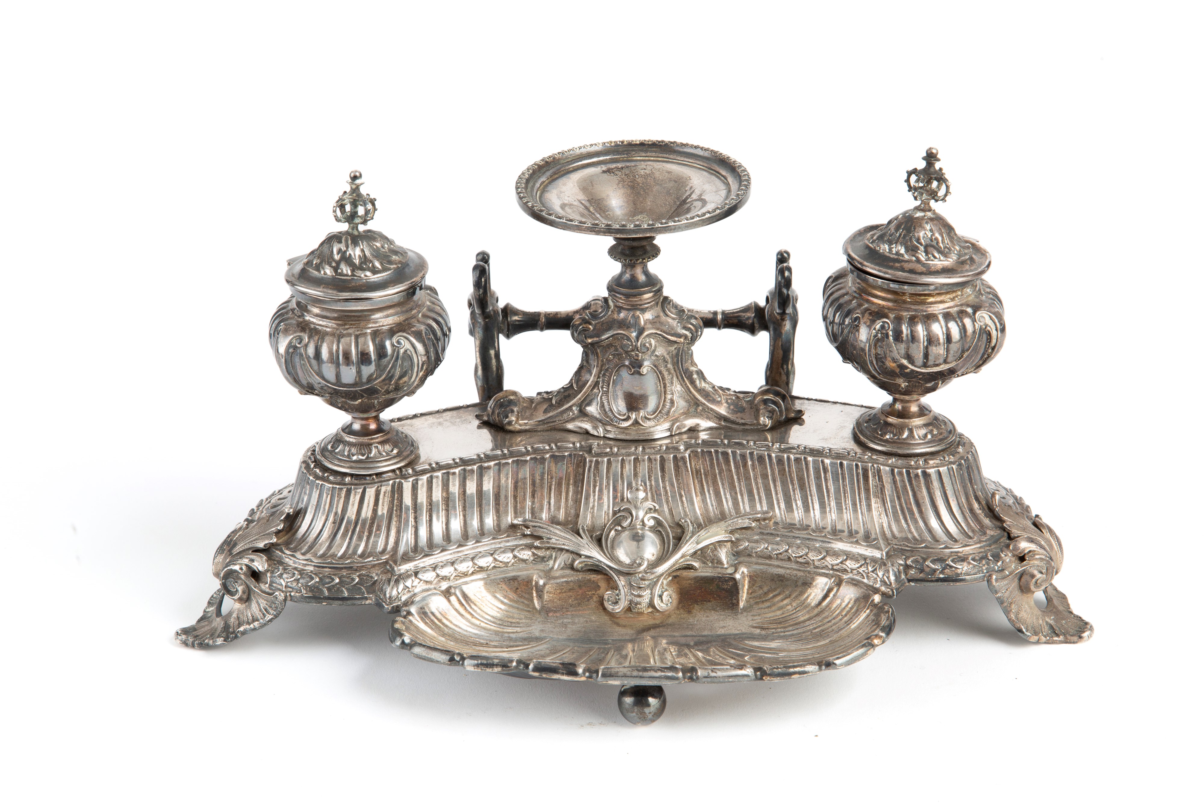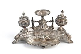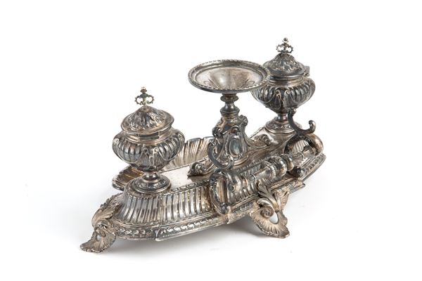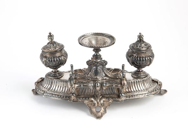 Calamaio in argento 800 finemente cesellato, gr. 490 ca. Punzoni sul fondo. Fine XIX secolo.