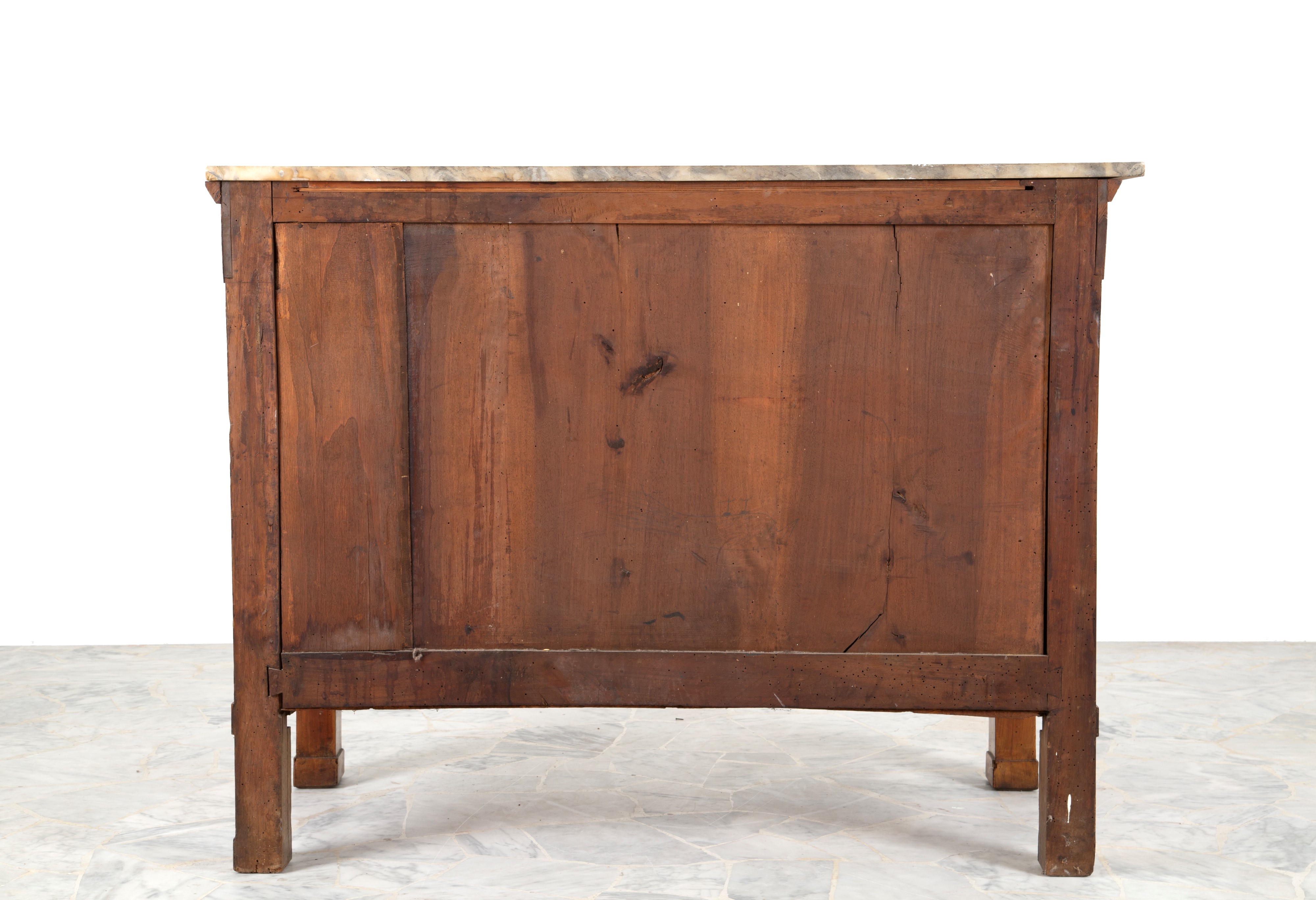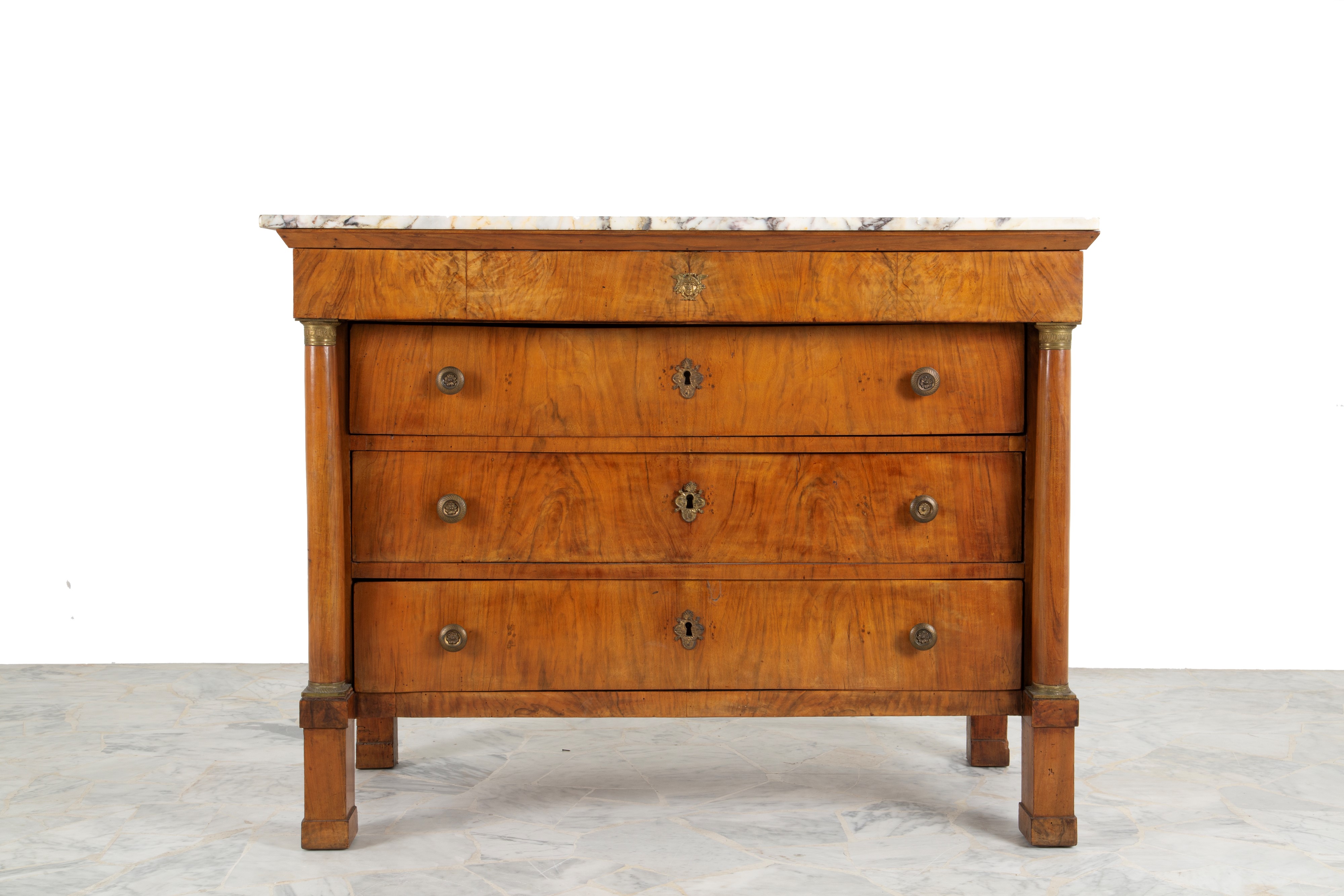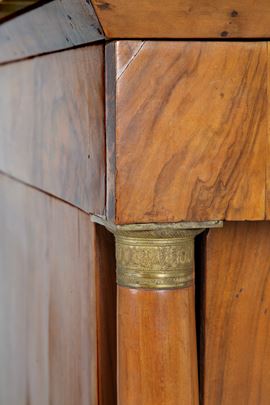 Cassettone lastronato in radica con colonne, applicazioni in bronzo dorato e piano in marmo. XIX secolo. Lievi difetti e mancanze.