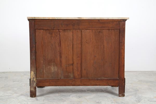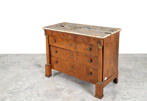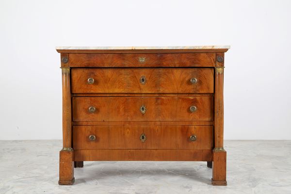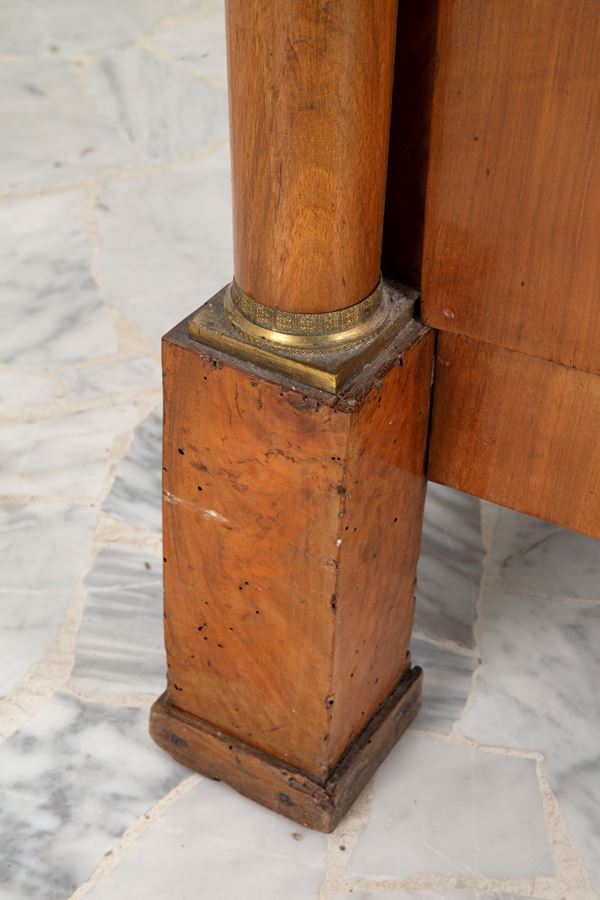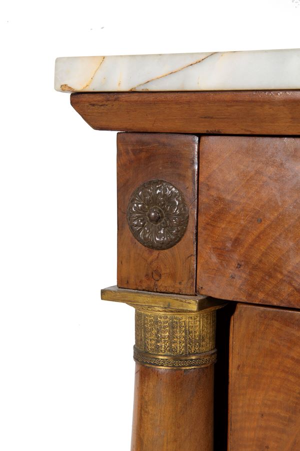 Cassettone lastronato in radica con colonne, applicazioni in bronzo dorato e piano in marmo. XIX secolo. Lievi difetti e mancanze.