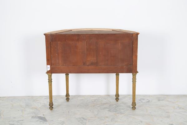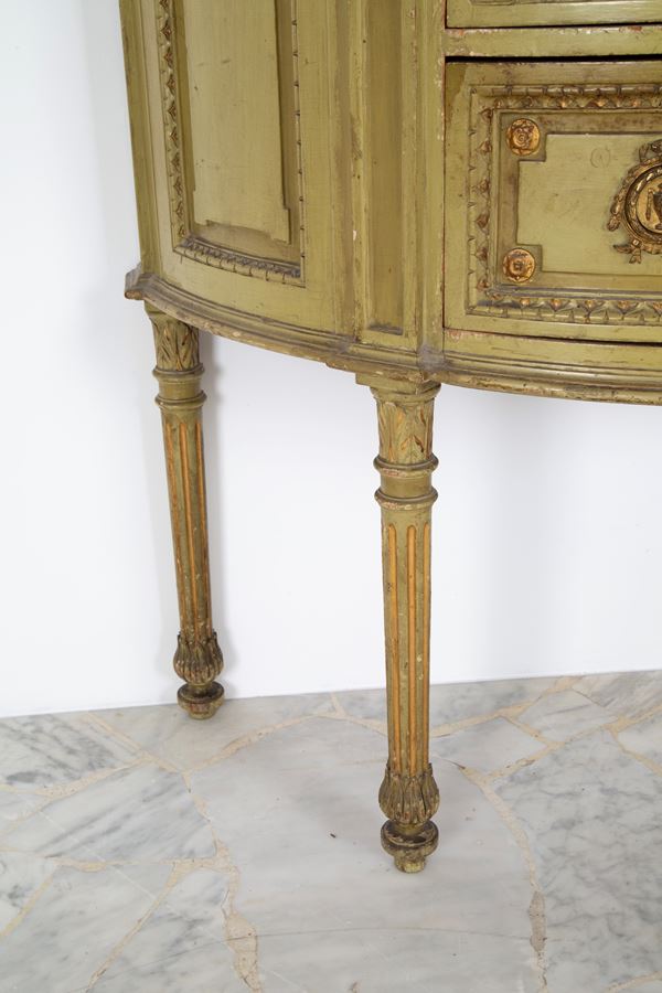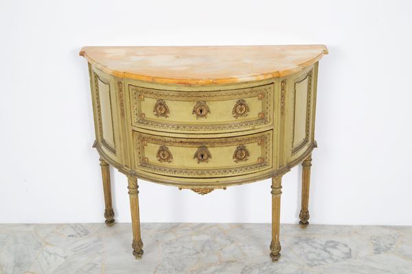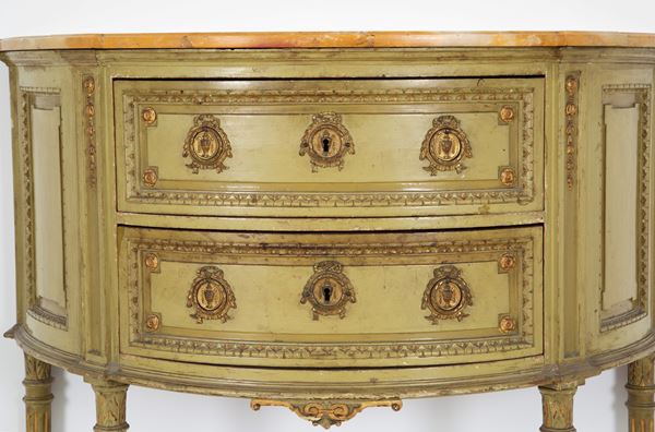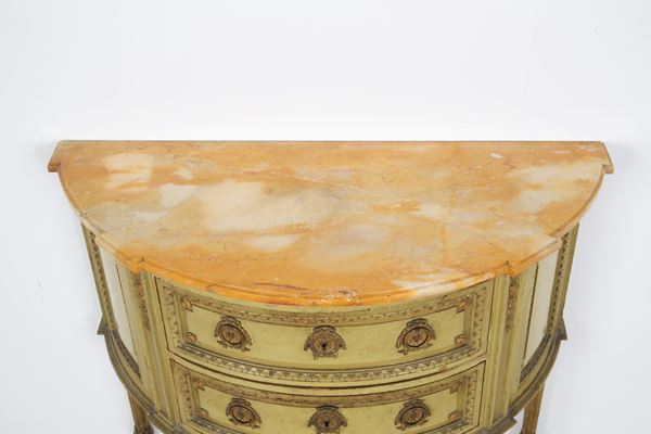 Comò a mezzaluna in legno laccato con guarnizioni in bronzo dorato, gambe rastramate e piano in marmo giallo. XIX secolo.