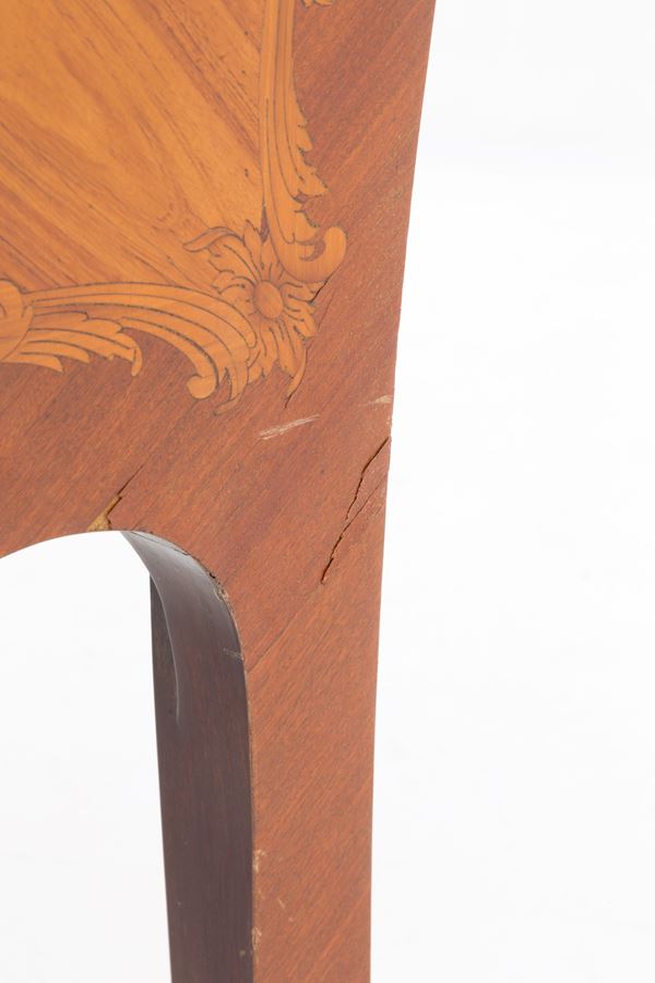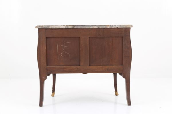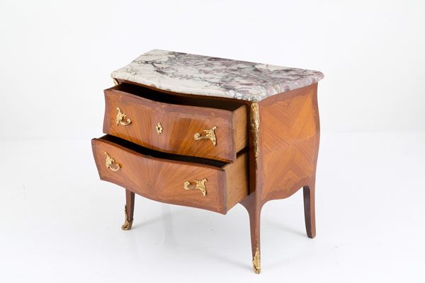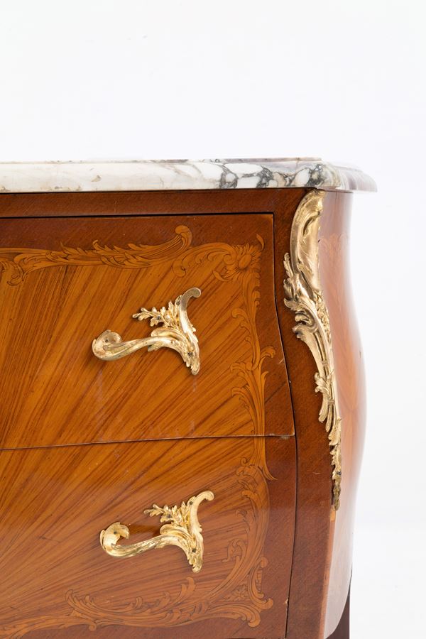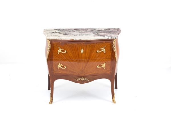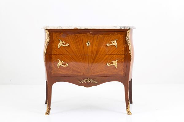 Comò lastronato e intarsiato in legni vari con finiture in bronzo cesellato e dorato e piano in marmo Breccia Antica. Fine XIX secolo. Difetti.