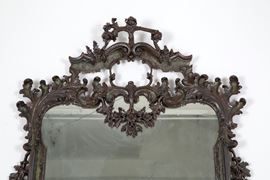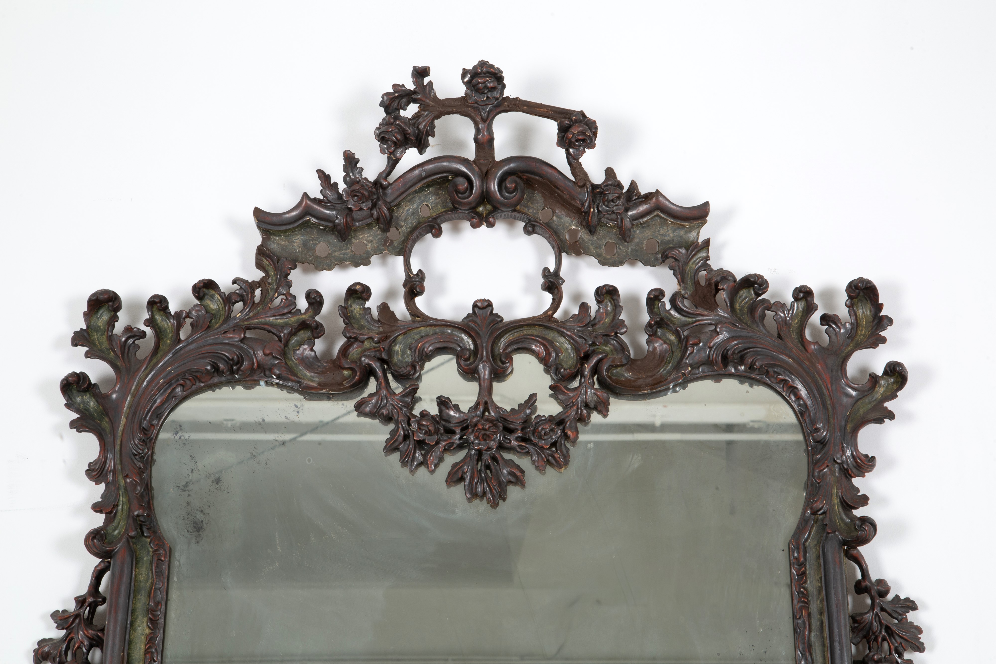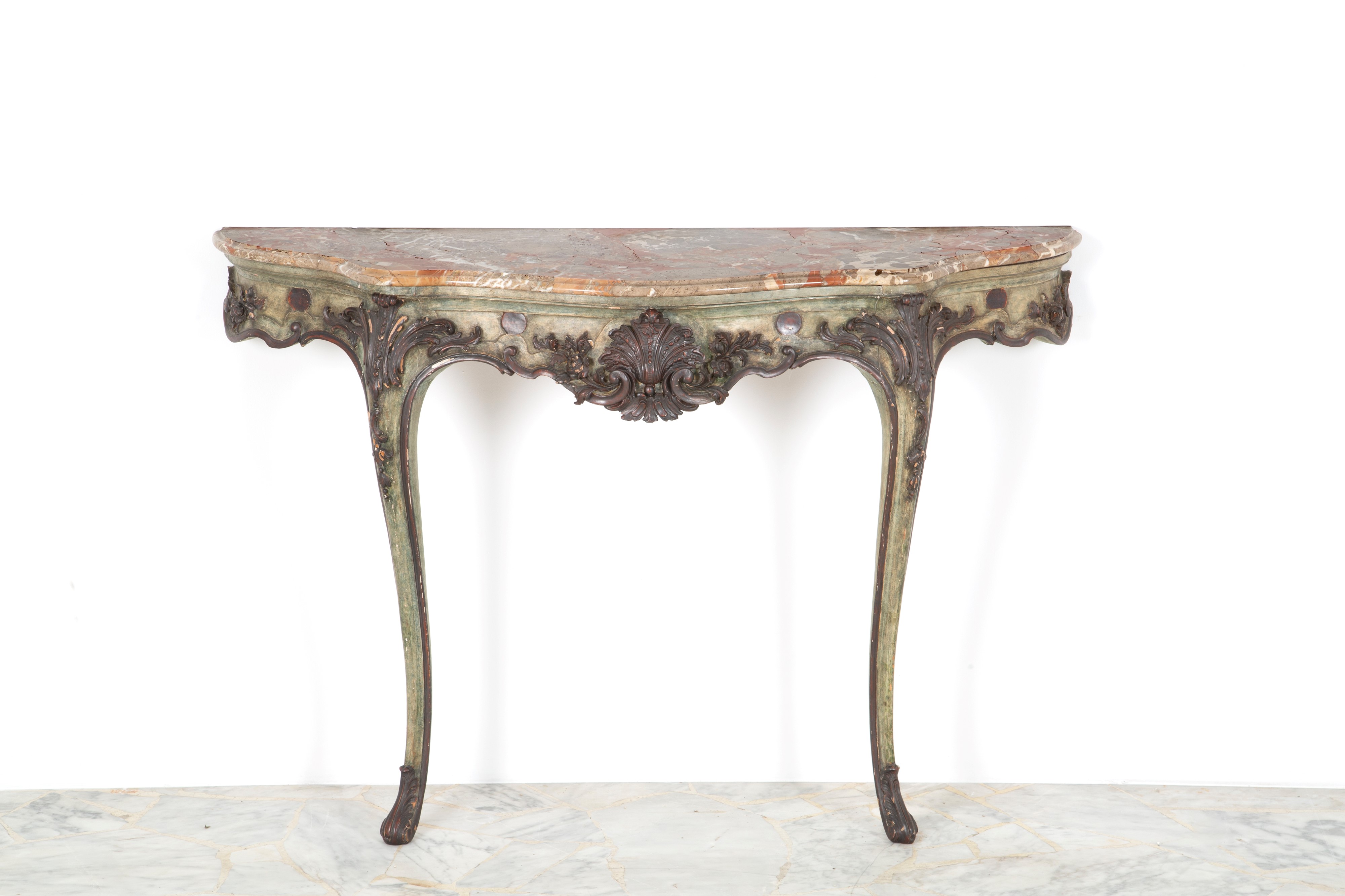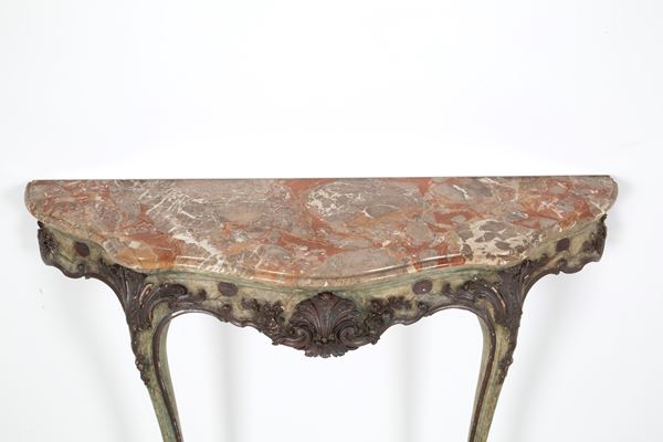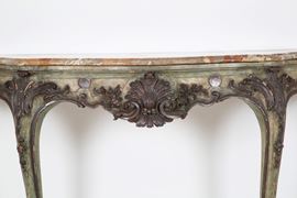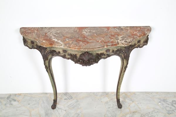 Consolle in legno intagliato e laccato a motivi floreali con specchiera e piano in marmo. Fine XIX secolo. Difetti e mancanze.