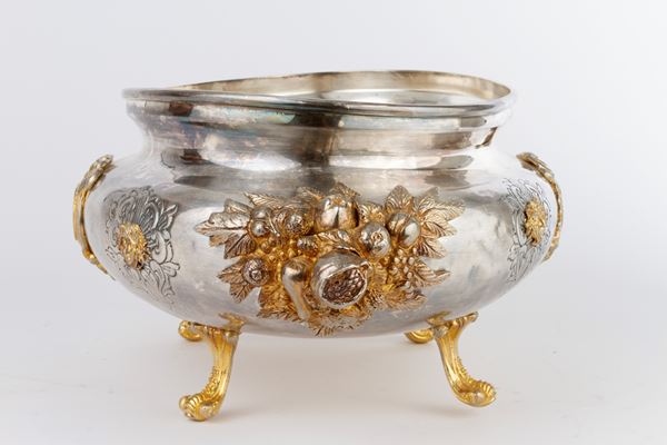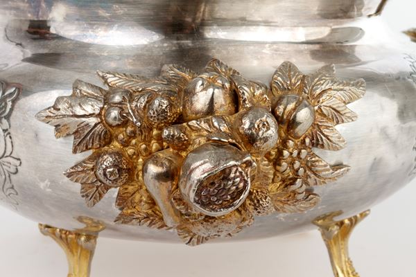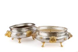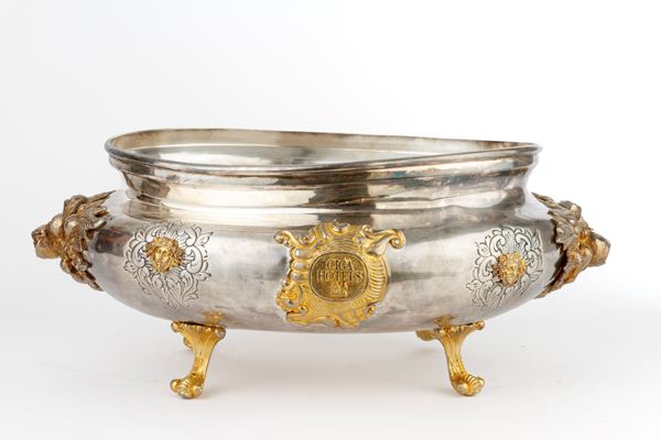 Coppia di cachepot ovali in metallo argentato e dorato. Prodotti per CIGA HOTELS. XX secolo. Segni di usura e del tempo.
