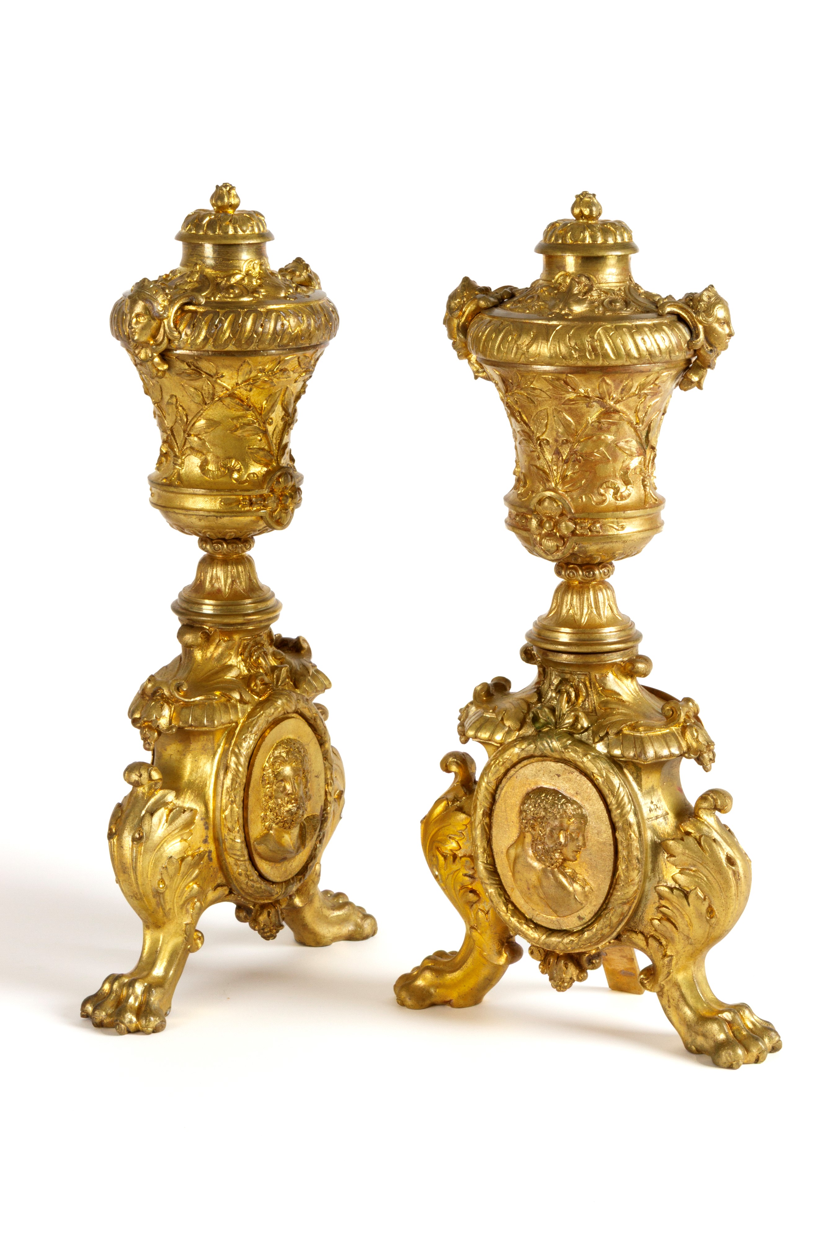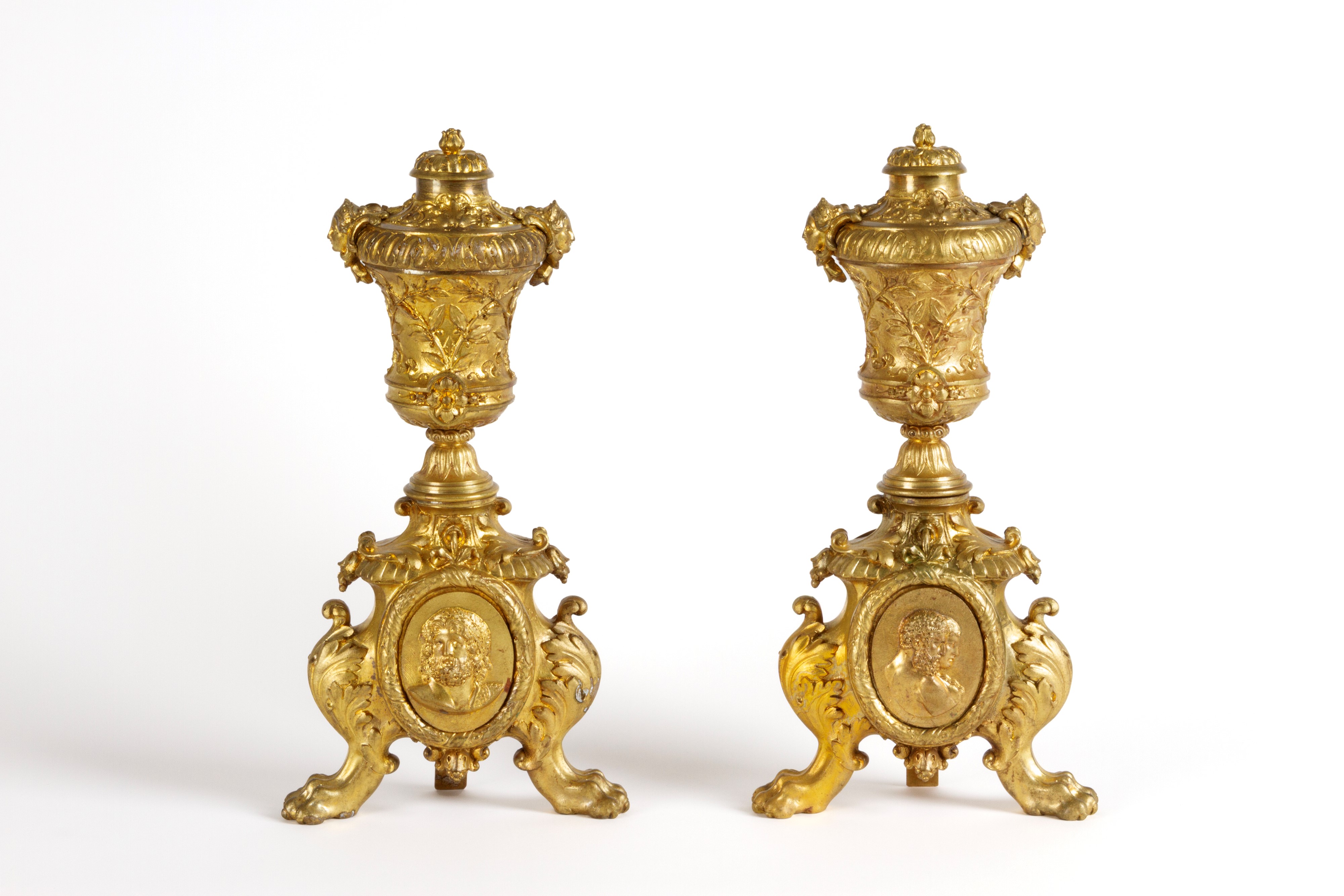 Coppia di elementi da decoro in bronzo finemente cesellato e dorato. Fine XIX secolo.