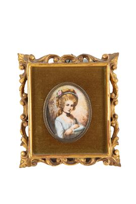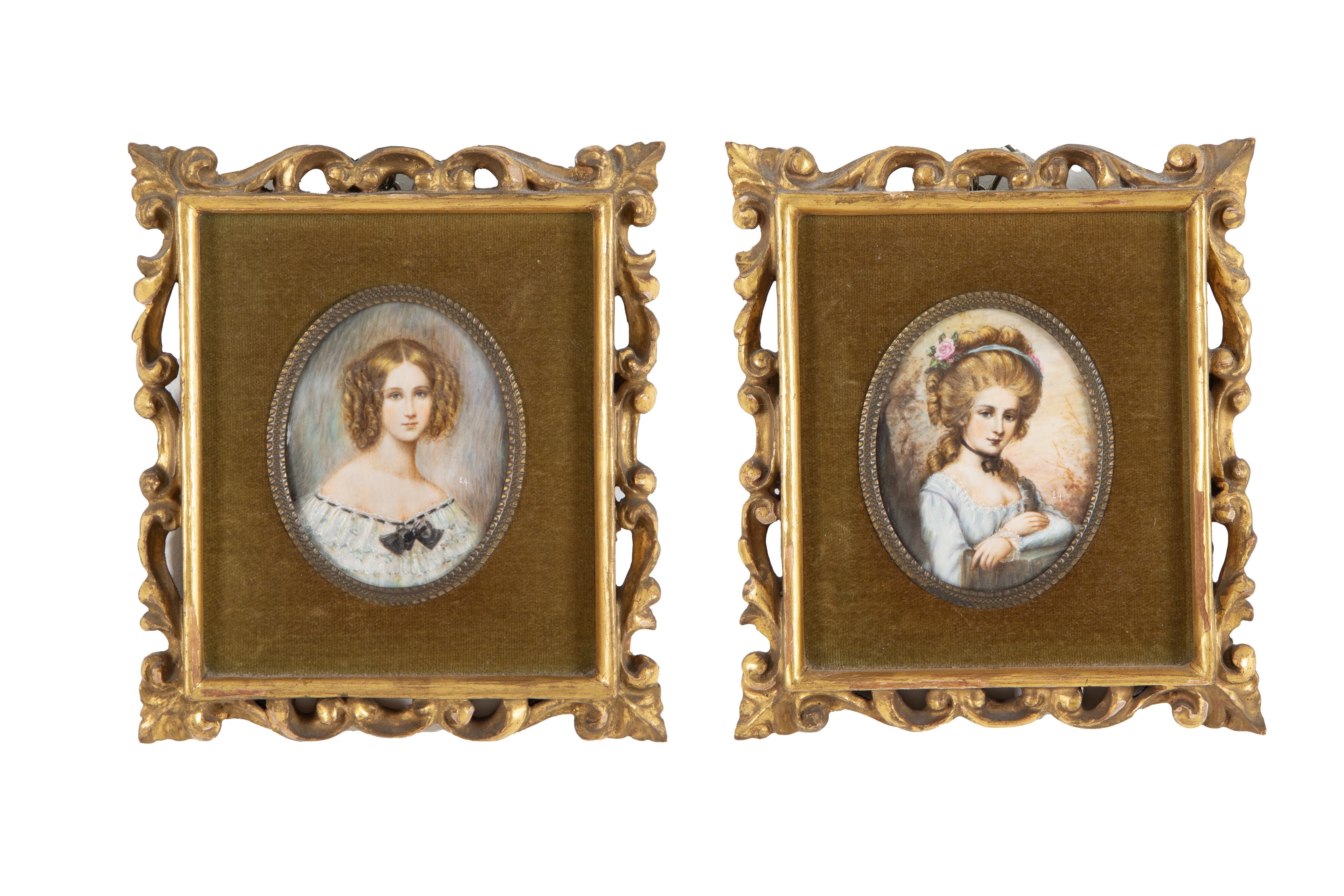 Coppia di miniature dipinte raffiguranti "GENTIDONNE". Siglate E.G. in basso a destra. In cornici in legno intagliato e dorato. XX secolo.
