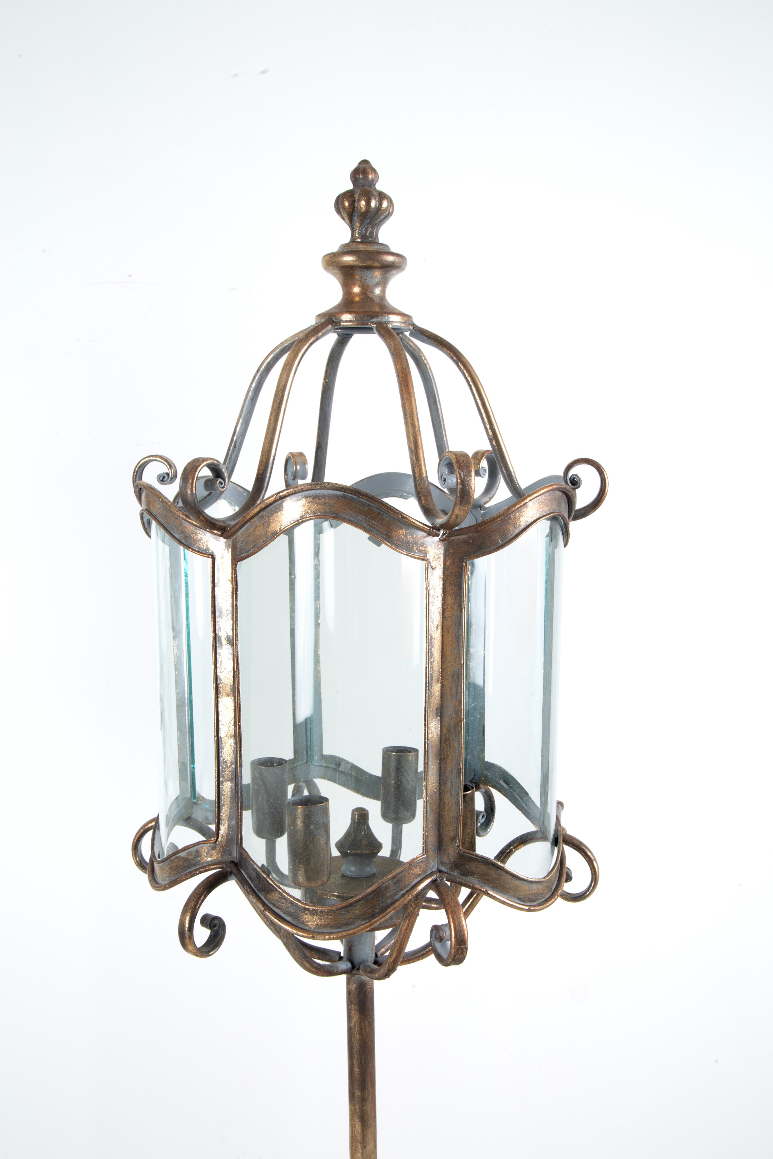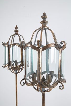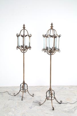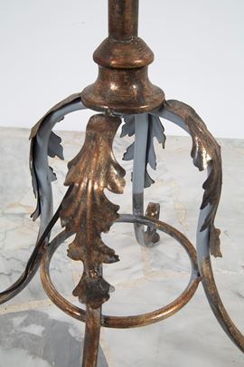 Coppia di piantane quattro luci in lamierino dorato. XX secolo. Difetti.