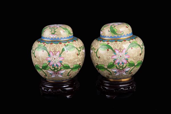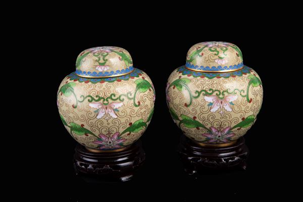 Coppia di potiche cloisonné. Basi in legno. Cina.