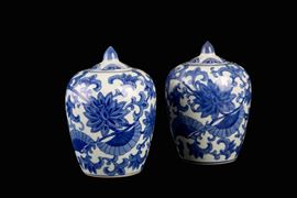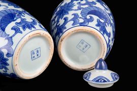Coppia di potiche in porcellana bianca e blu. Marcate sul fondo. Cina.