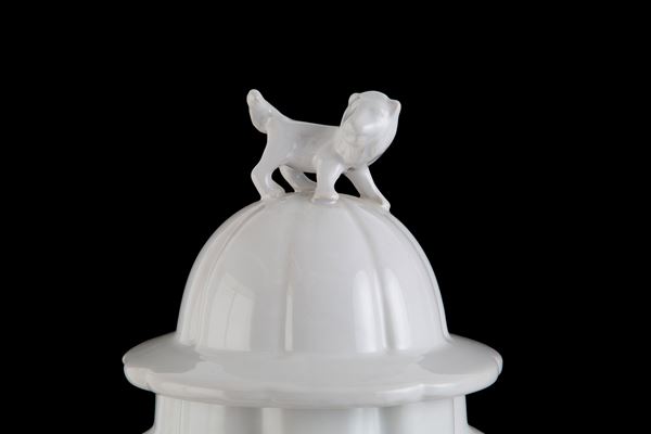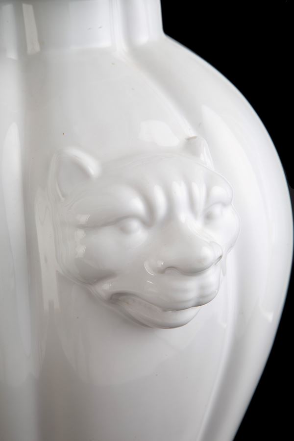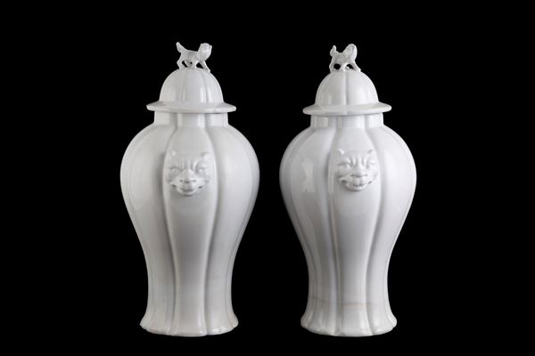 Coppia di potiche biansate in porcellana bianca con mascheroni. XX secolo.