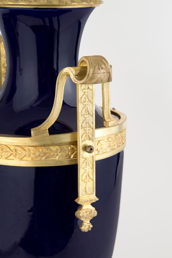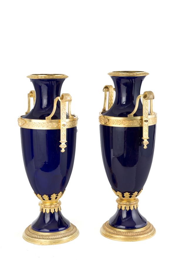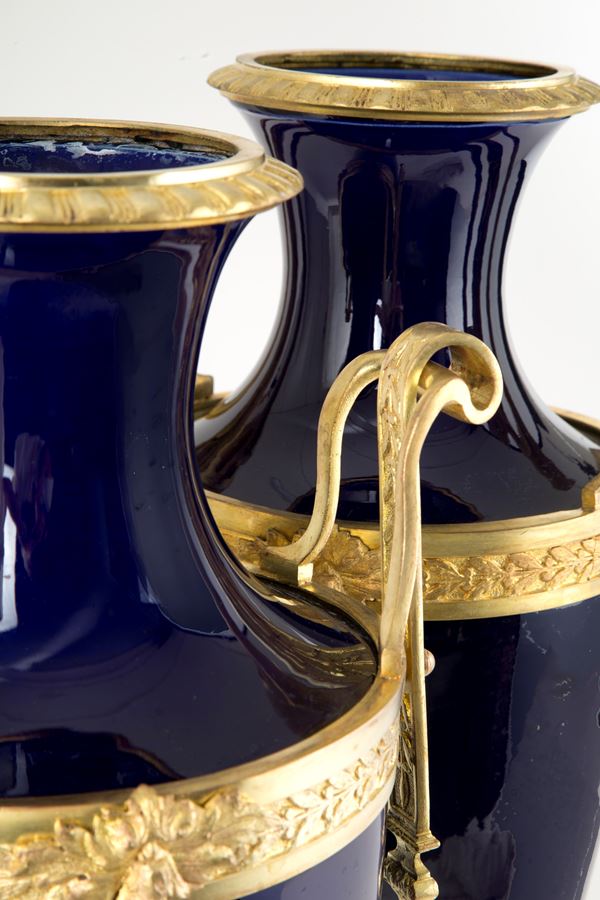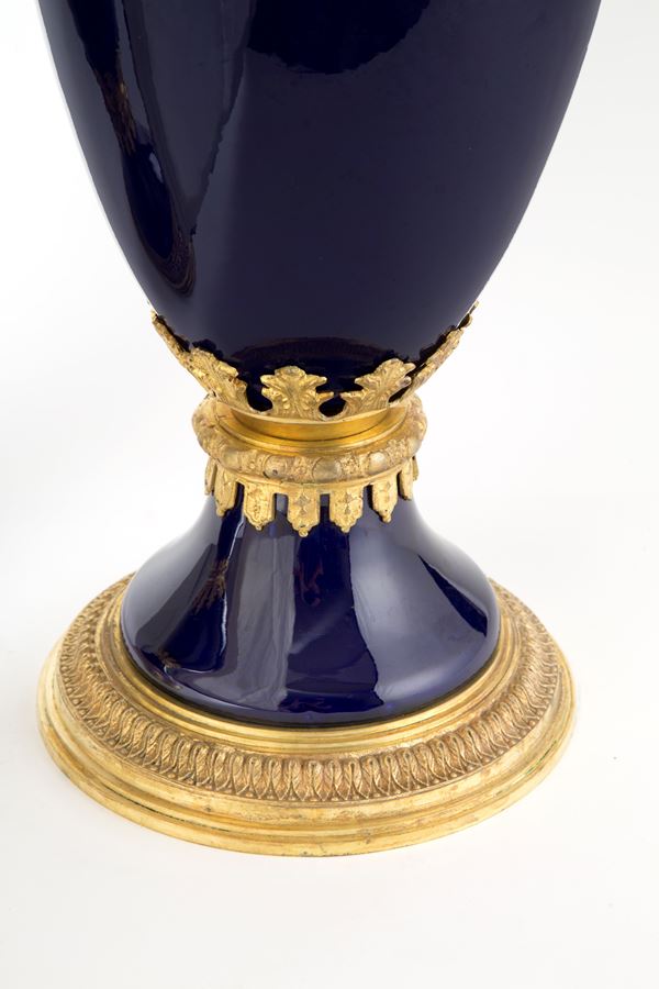 Coppia di vasi in ceramica blu cobalto con eleganti finiture in bronzo cesellato e dorato. Francia. Fine XIX secolo. Lievi difetti.