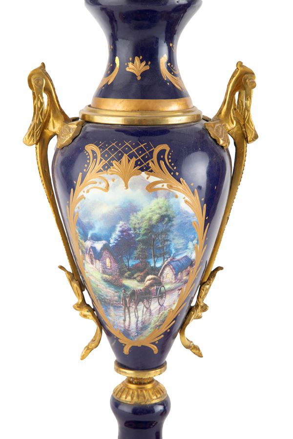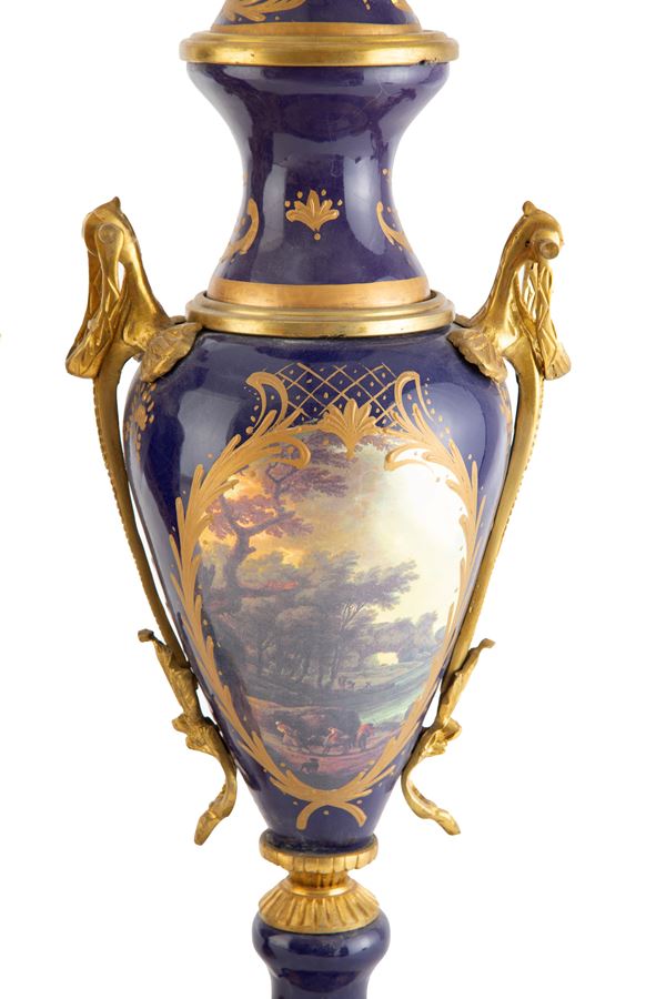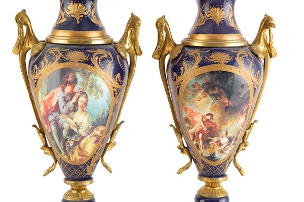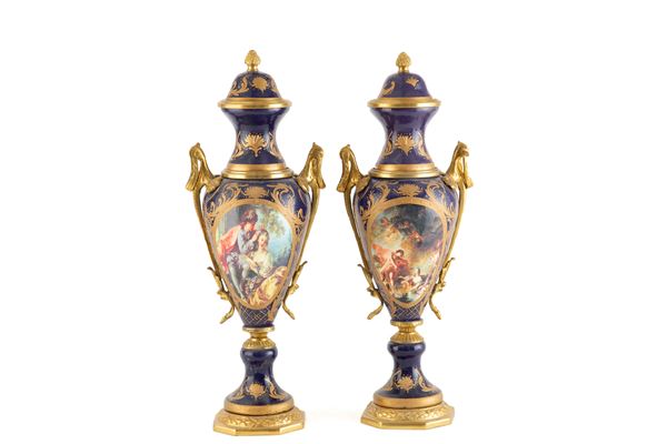 Coppia di vasi con coperchio in porcellana fondo blu con paesaggi animati entro riserve e finiture in bronzo dorato. Fine XIX secolo.