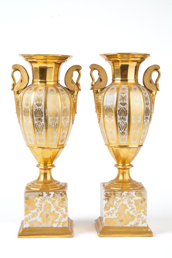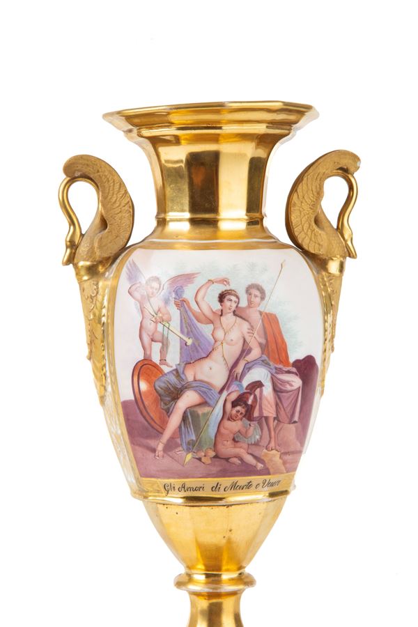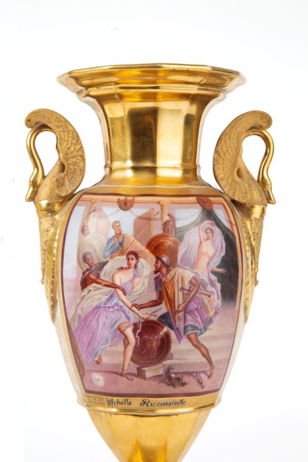 Coppia di vasi in porcellana dipinta con scene raffiguranti "GLI AMORI DI MARTE E VENERE" e "ACHILLE RICONOSCIUTO". Napoli. Inizi XIX secolo.