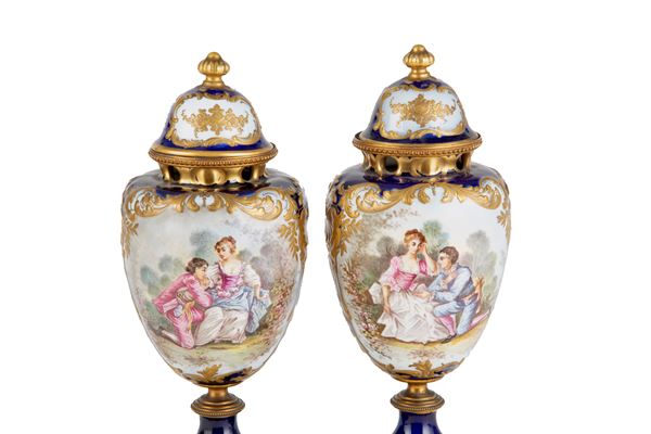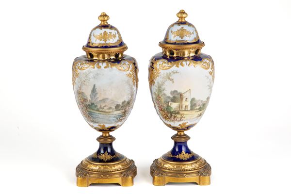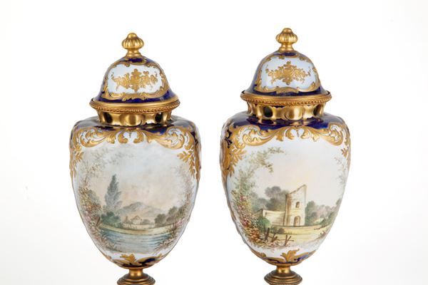 Coppia di vasi in porcellana dipinta con scene di paesaggi e galanti al centro, altorilievi in oro a ramage e applicazioni in bronzo dorato. Marcati SEVRES e firmati H. POITEVIN. Periodo Napoleone III.