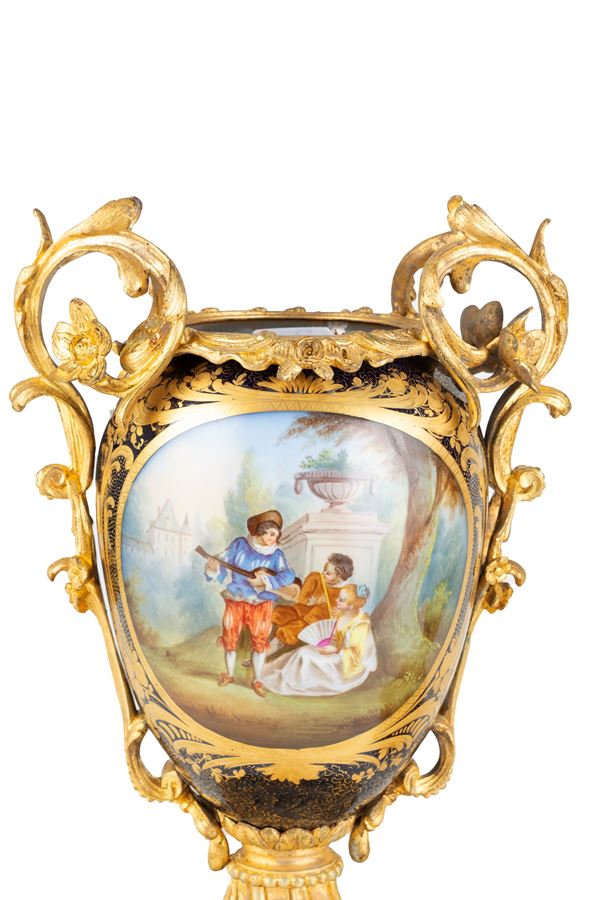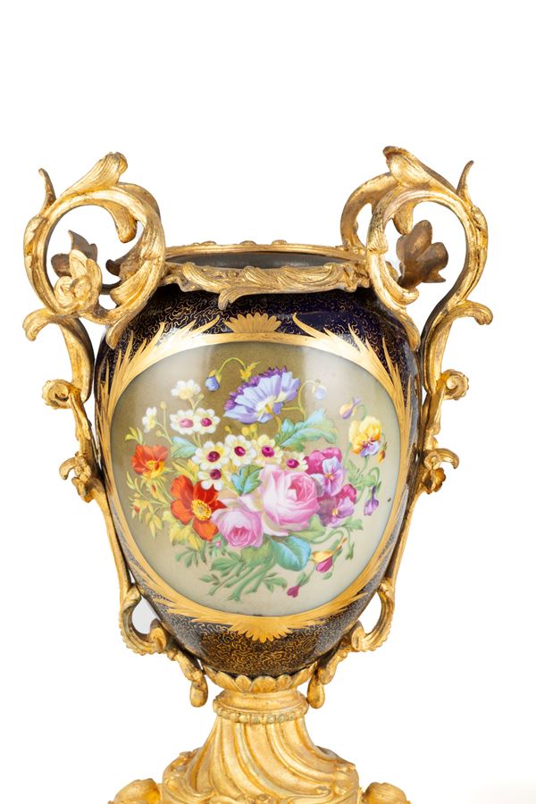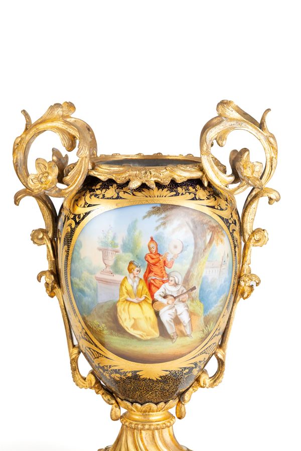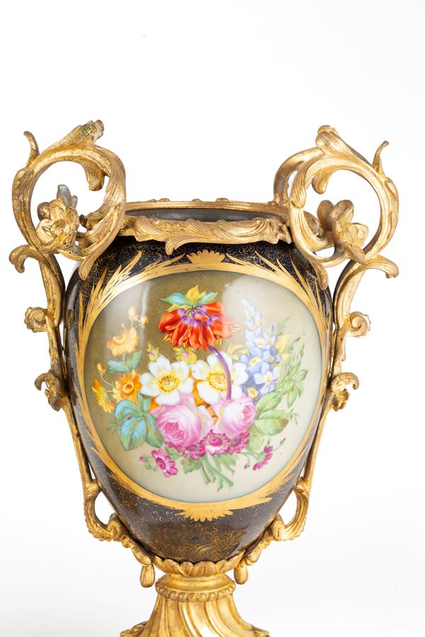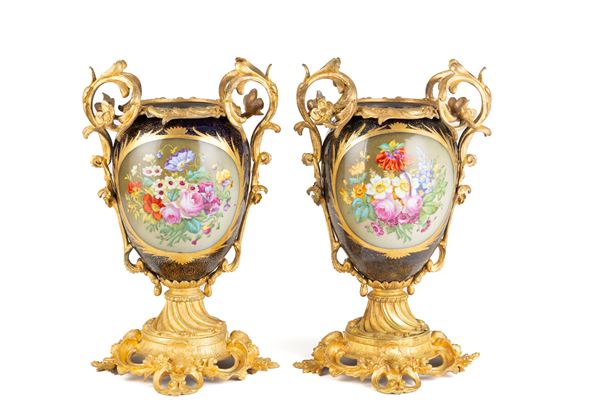 Coppia di vasi di Sevres in porcellana e bronzo cesellato e dorato con lumeggiature. Fine XIX secolo.