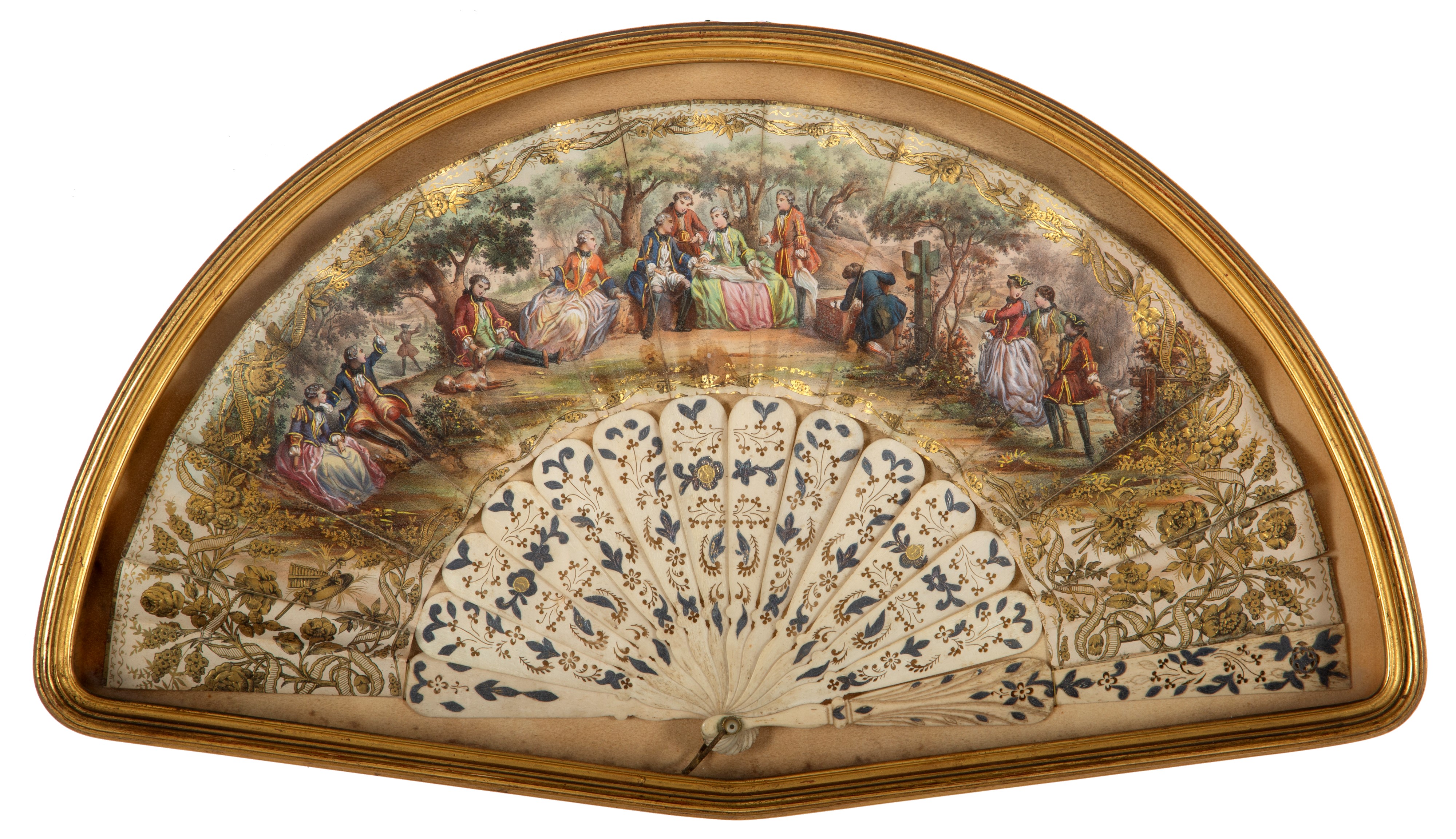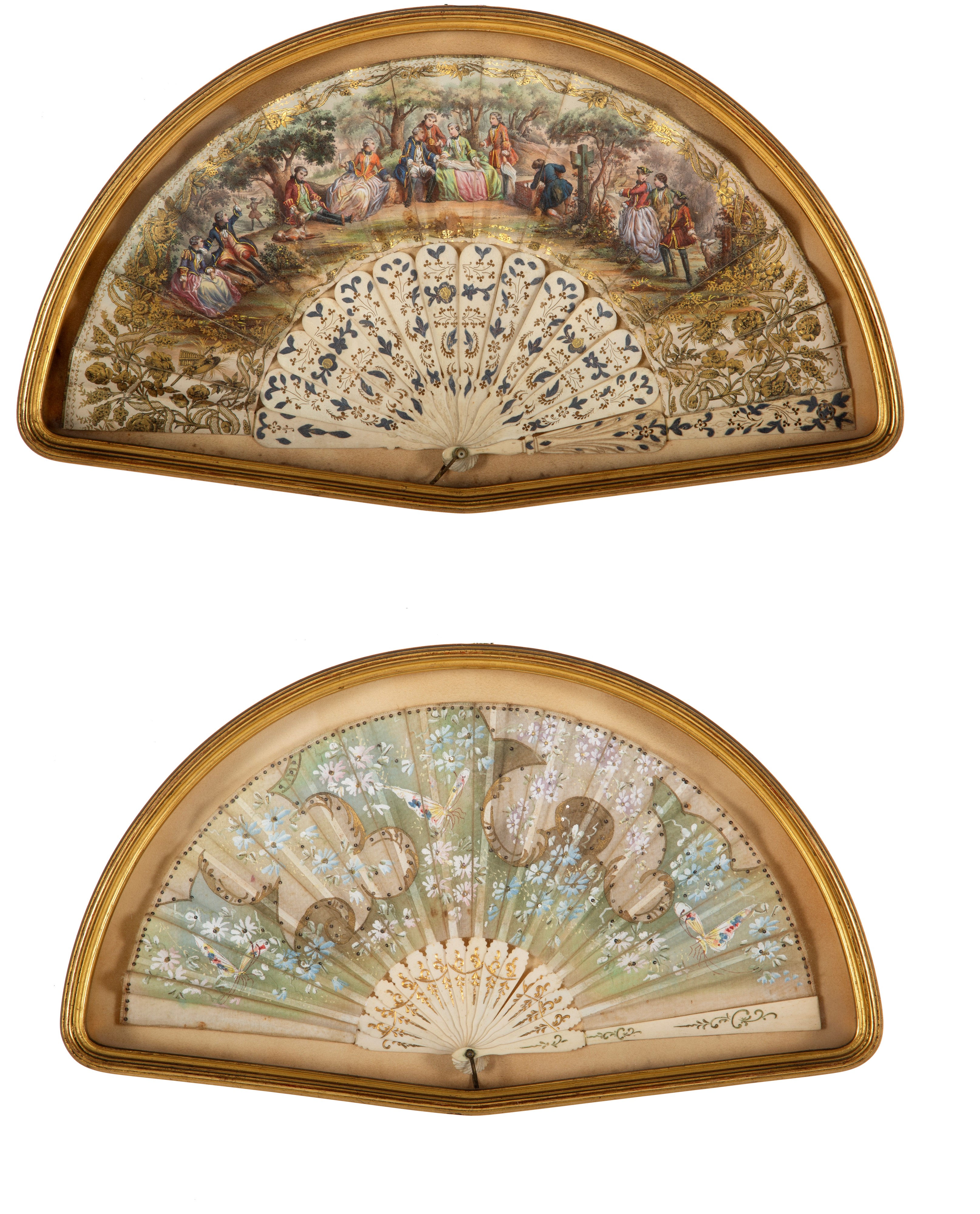Coppia di ventagli dipinti in teca in legno intagliato e dorato. XIX secolo.