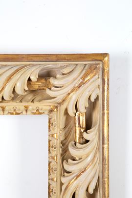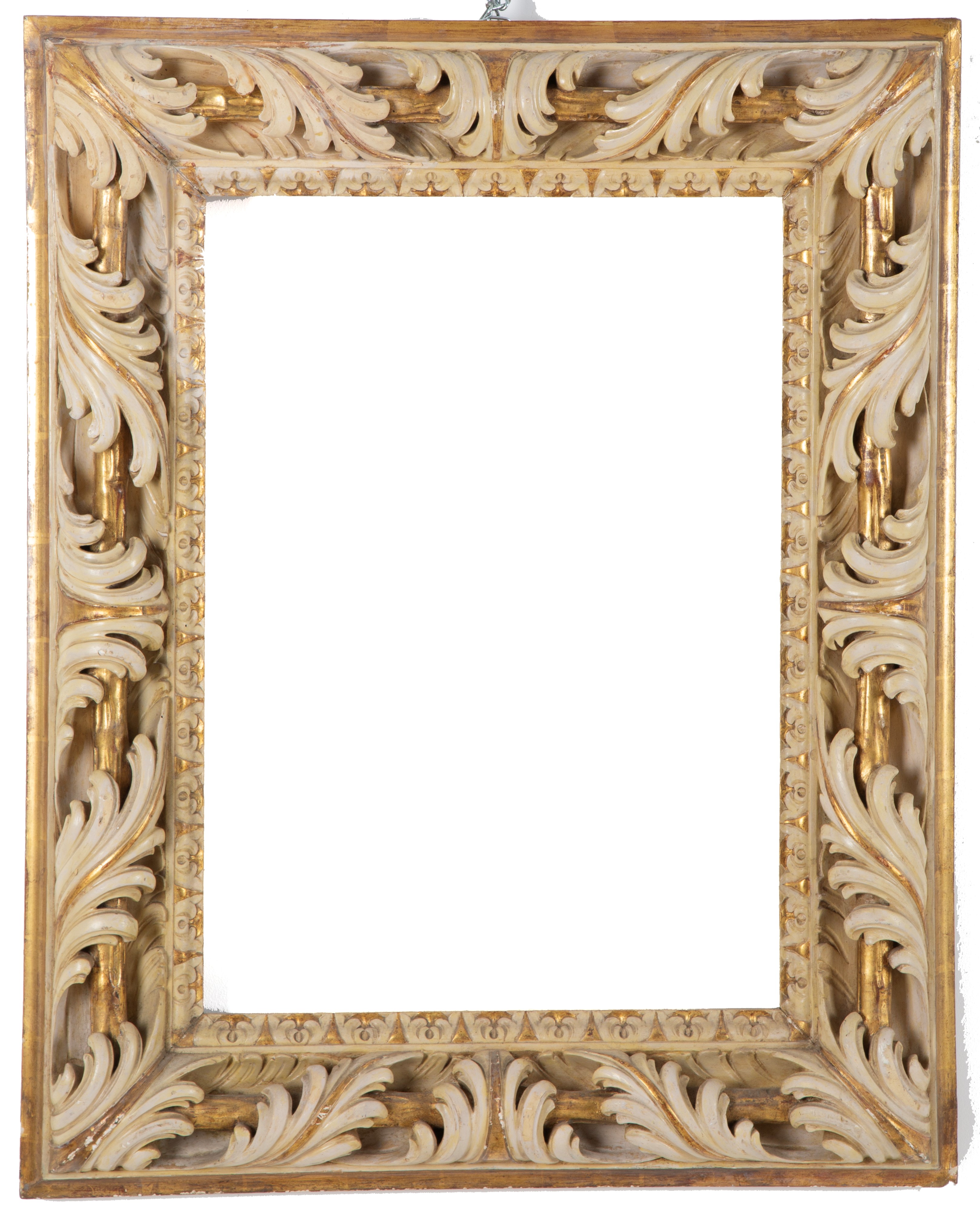 Cornice in legno intagliato, laccato e dorato. Fine XVIII-inizi XIX secolo. Lievi difetti.