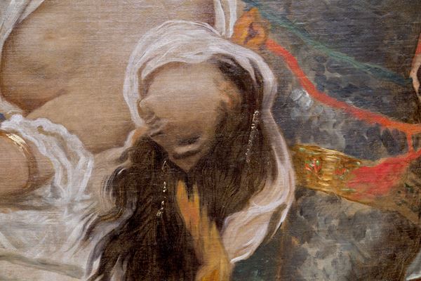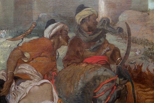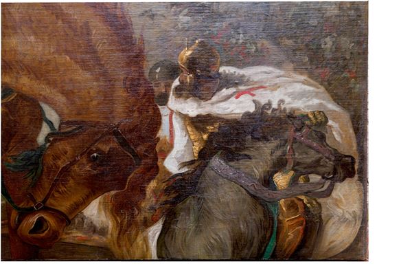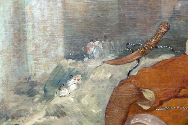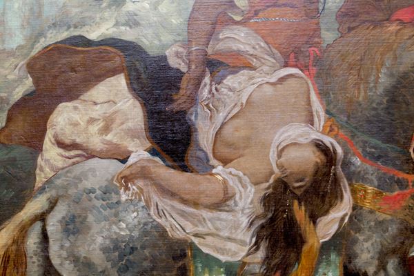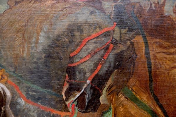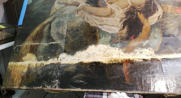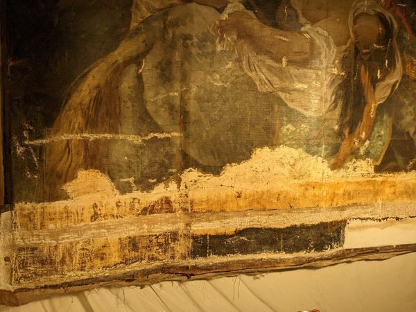 Dipinto olio su tela raffigurante "IL RATTO DI REBECCA". Restauri. Già rintelato e rintelaiato. Durante il restauro del 2021, rimossa la giunta non originale (Alt. 30 cm ca.) nella parte inferiore del dipinto (immagine 8), probabilmente inserita in precedenza per ripristinare un danno da risalita di umidità sulla tela originaria (immagine 9). Corredato di attestato di libera circolazione.