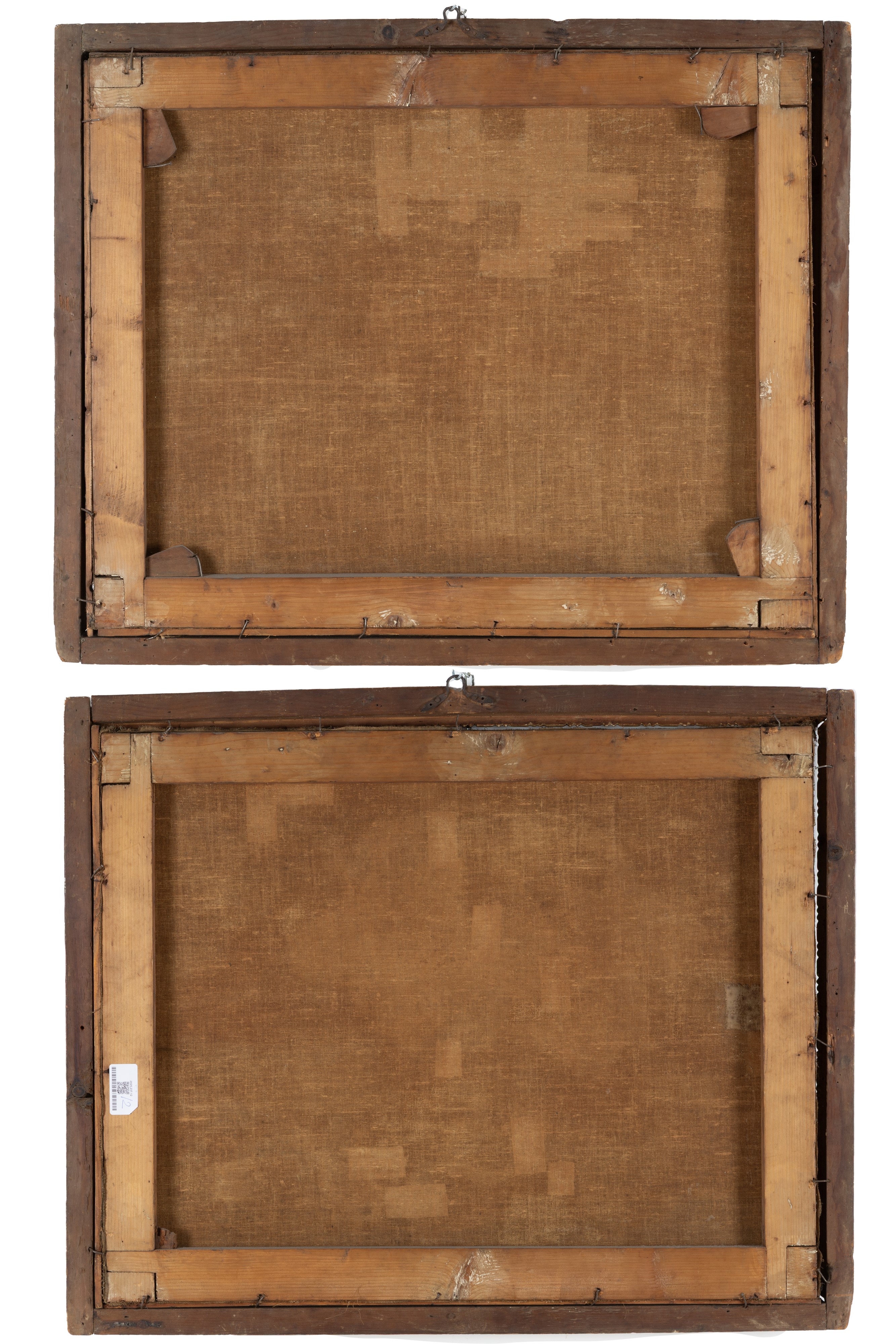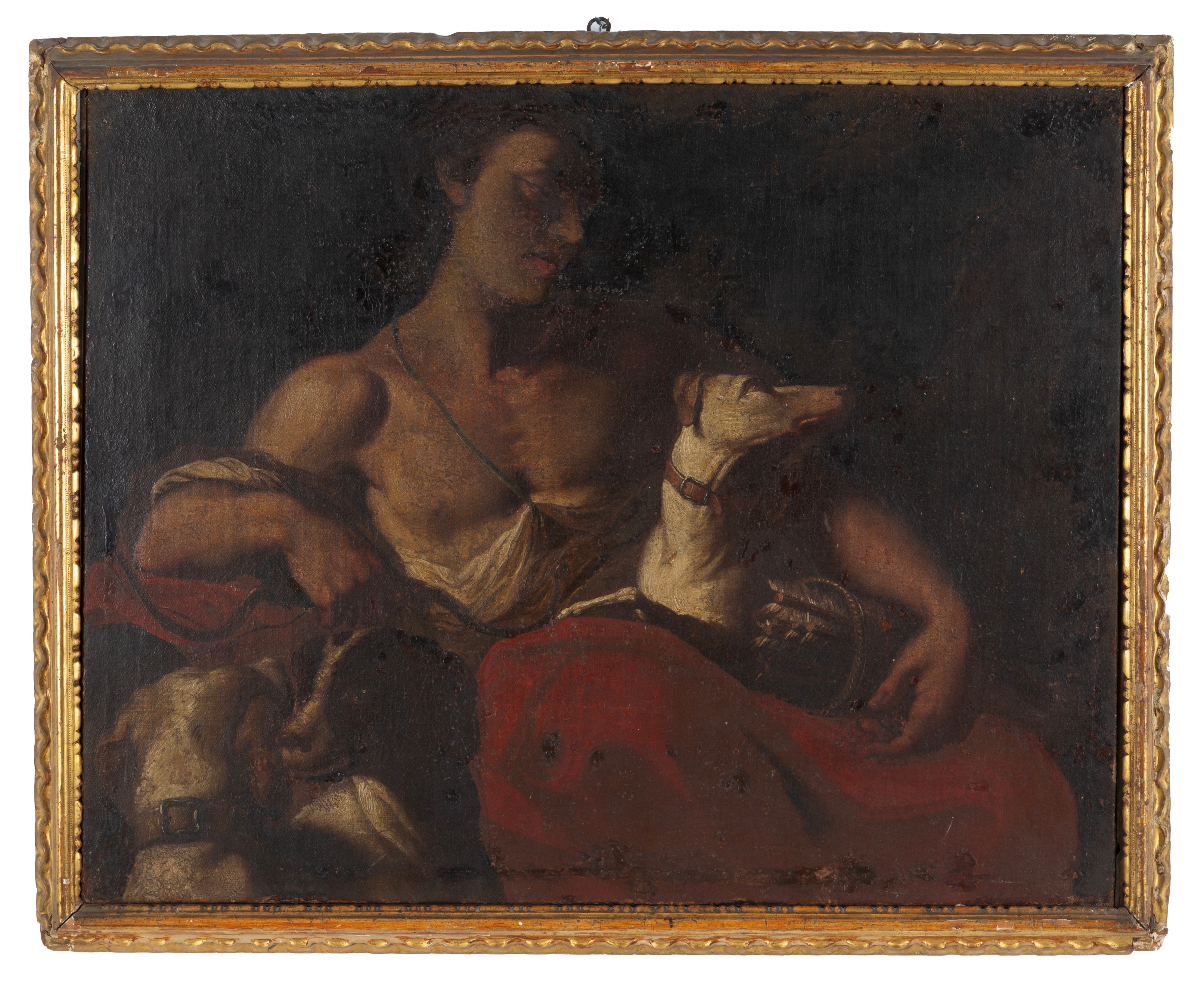 Dipinti olio su tela raffiguranti "FIGURA FEMMINILE CON COLOMBE" e "UOMO CON CANI". Fine XVII secolo. Difetti e restauri. In cornici coeve in legno dorato.