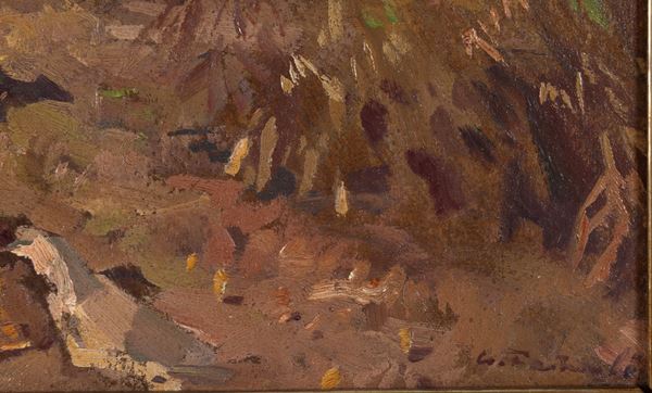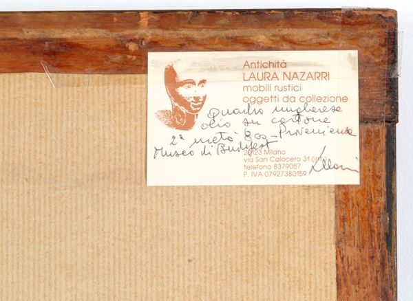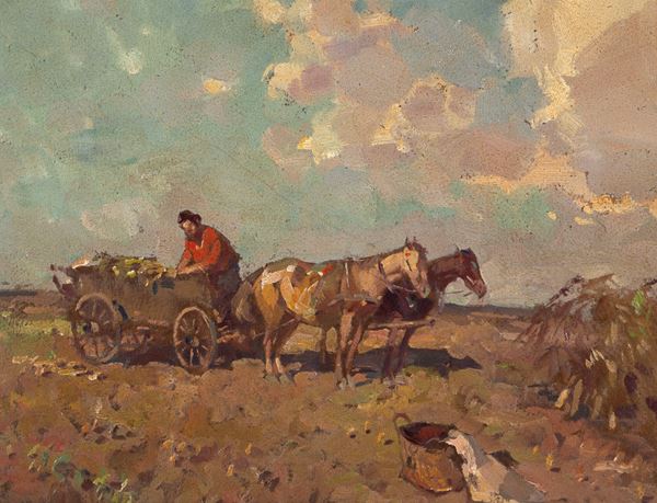 Dipinto olio su cartone raffigurante "CARRO CON BUOI". Firma non identificata in basso a destra. In cornice in legno laccato.