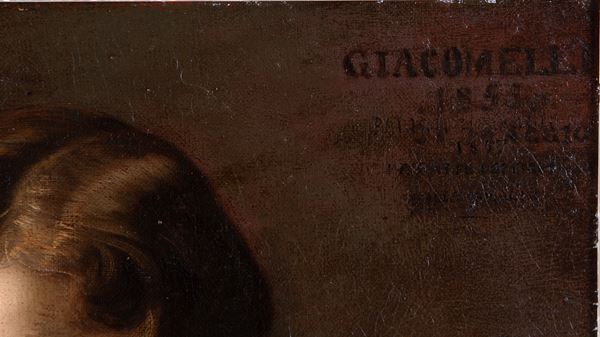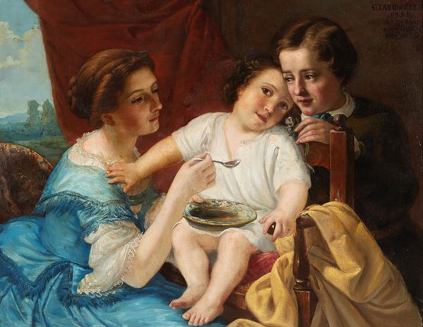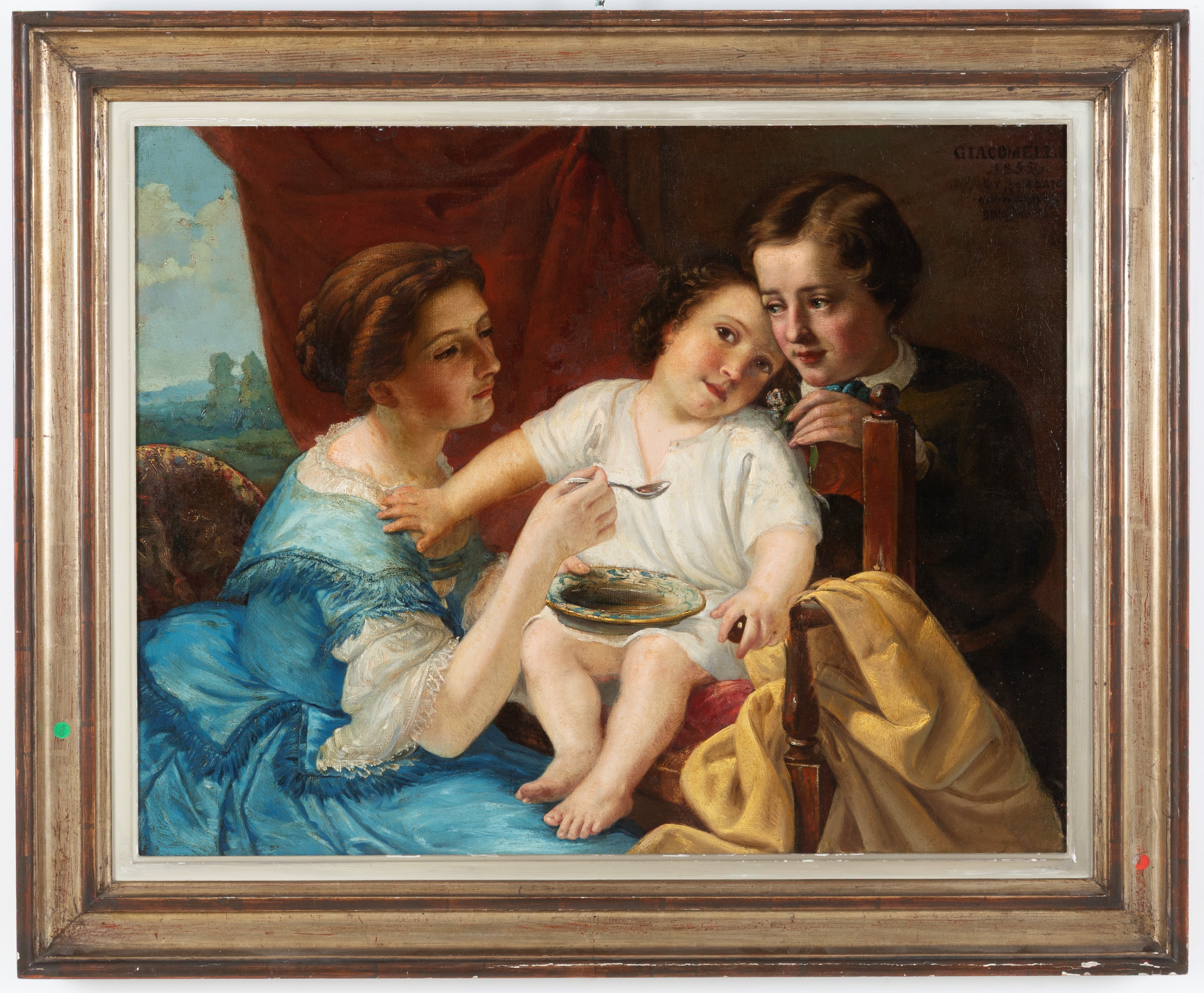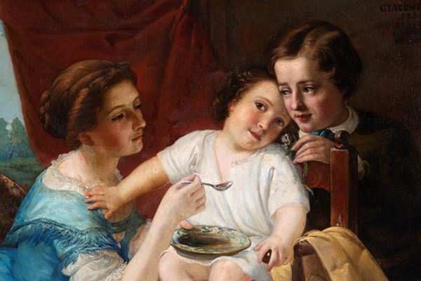 Dipinto olio su tela raffigurante "FAMIGLIA". Firmato e datato GIACOMELLI 1855 in alto a destra. In cornice. Restauri.
