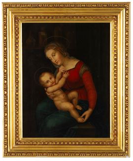 Dipinto olio su tela raffigurante "MADONNA CON BAMBINO". Seconda metà del XIX secolo. In cornice dorata.