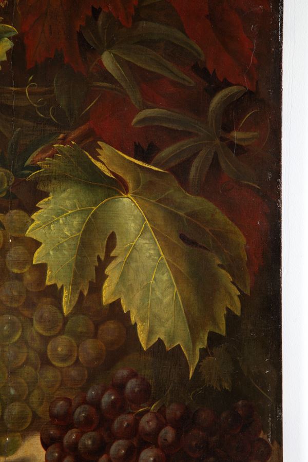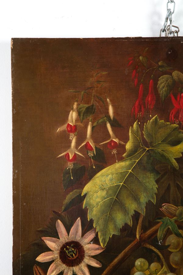 Dipinto olio su tavola raffigurante "NATURA MORTA". XIX secolo. Difetti e restauri.