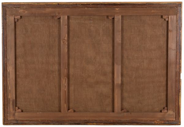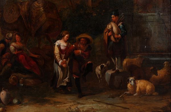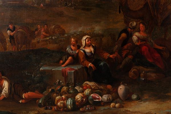 Dipinto olio su tela raffigurante "PAESAGGIO CON SCENE DI VITA". XVII secolo. Lievi restauri. Già rintelato e rintelaiato. In cornice in legno dorato.