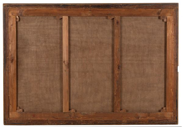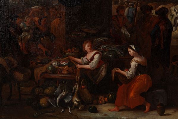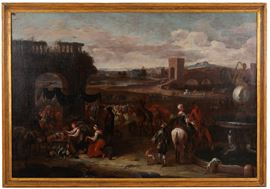 Dipinto olio su tela raffigurante "PAESAGGIO CON SCENE DI VITA". XVII secolo. Lievi restauri. Già rintelato e rintelaiato. In cornice in legno dorato.