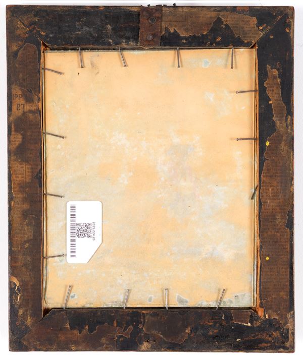 Dipinto tempera su pergamena raffigurante "PASTORELLO". XVIII secolo. In cornice in legno intagliato. Lievi restauri.