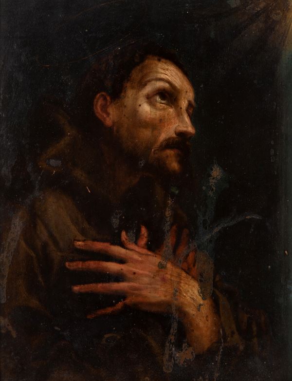 Dipinto olio su rame raffigurante "SAN FRANCESCO IN ESTASI". XVII secolo. In cornice in legno dorato. Restauri.