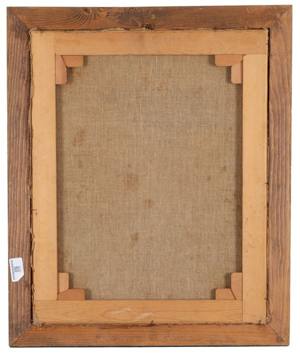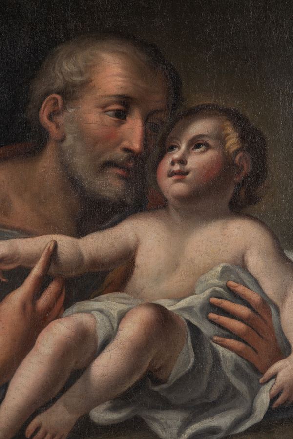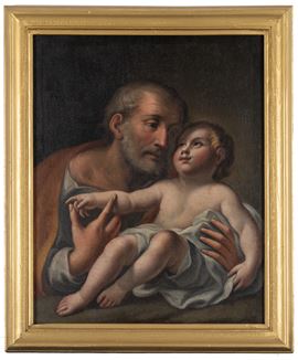 Dipinto olio su tela raffigurante "SAN GIUSEPPE CON GESU' BAMBINO". Inizi XVIII secolo. In cornice dorata. Già rintelato e rintelaiato.
