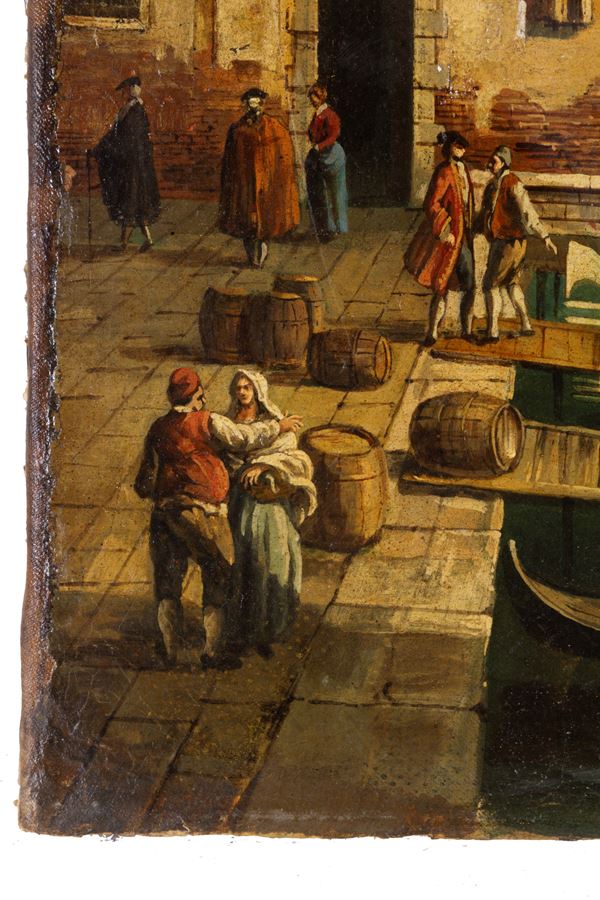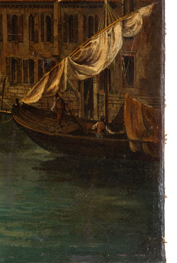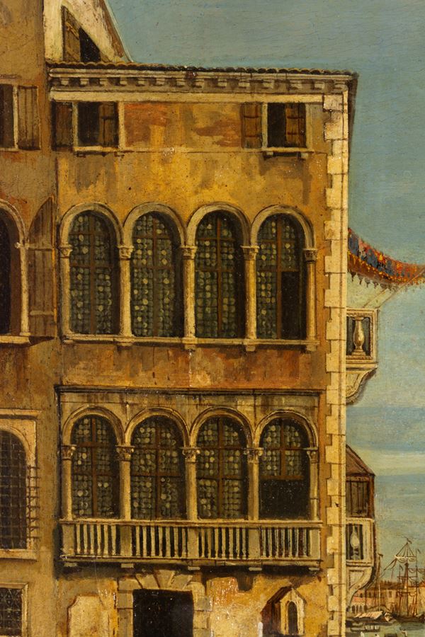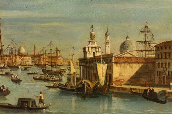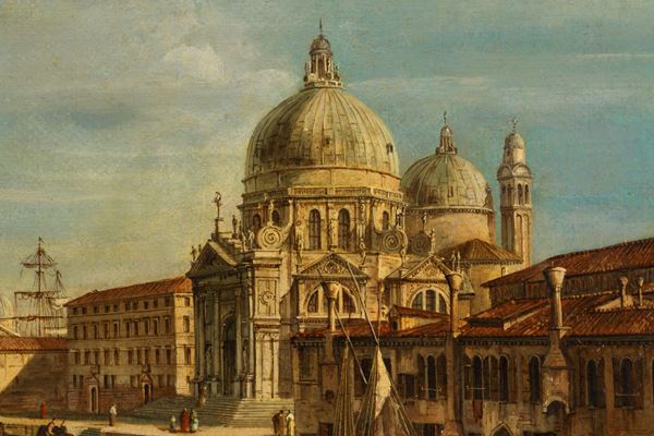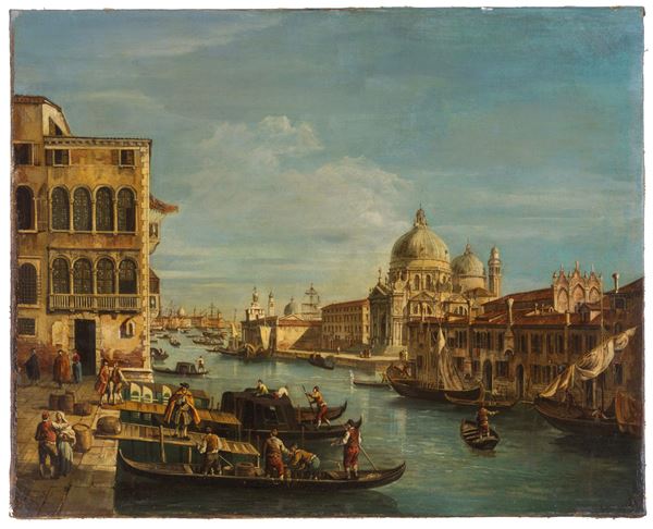 Dipinto olio su tela raffigurante "VEDUTA DI VENEZIA DAL CANAL GRANDE VERSO SANTA MARIA DELLA SALUTE". XIX secolo. In cornice in legno dorato non coeva. Lievi restauri. Già rintelato e rintelaiato.