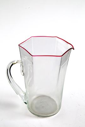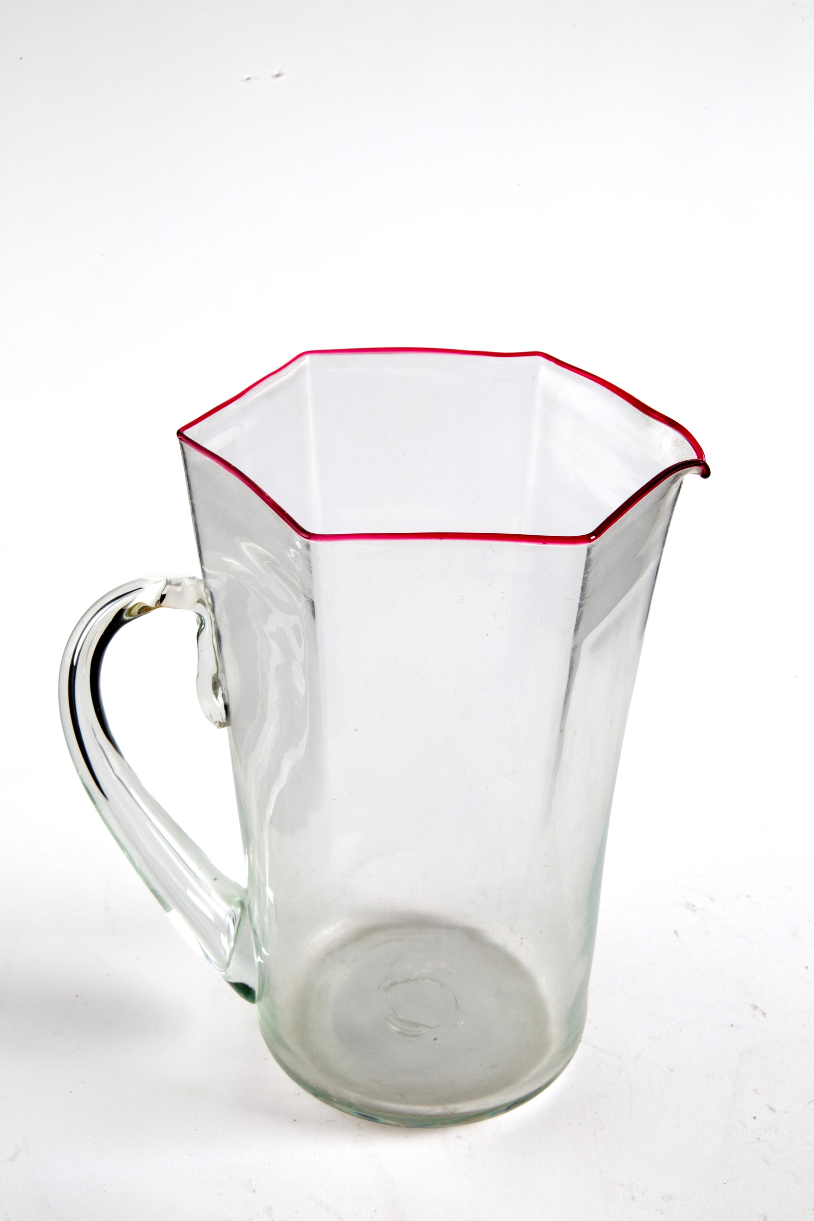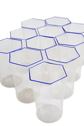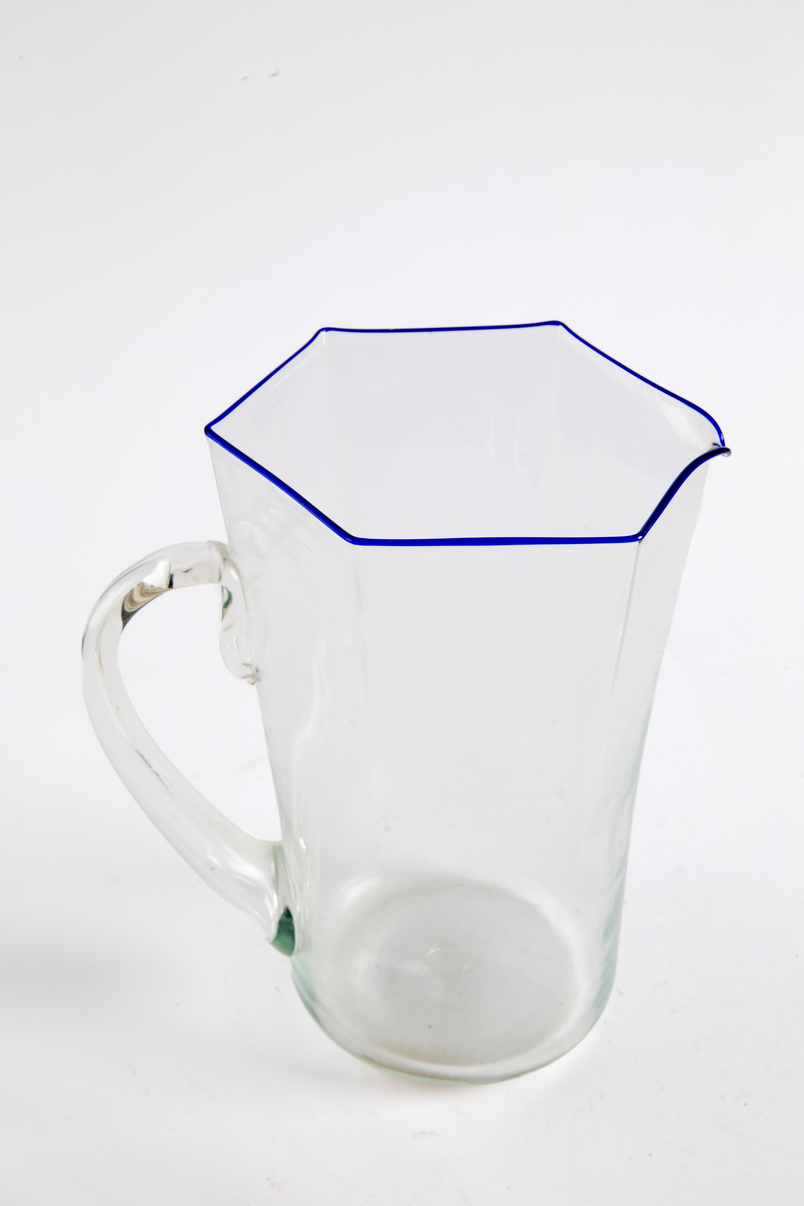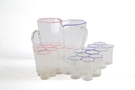 Due brocche e venti bicchieri in vetro soffiato di forma esagonale blu per l'acqua e rossi per il vino. Venezia. XX secolo.