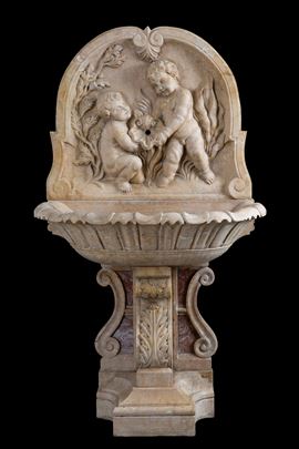 Fontana in marmo giallo Verona con inserzioni in marmo rosso Verona nella base e alzata ovale con putti scolpiti. XX secolo.