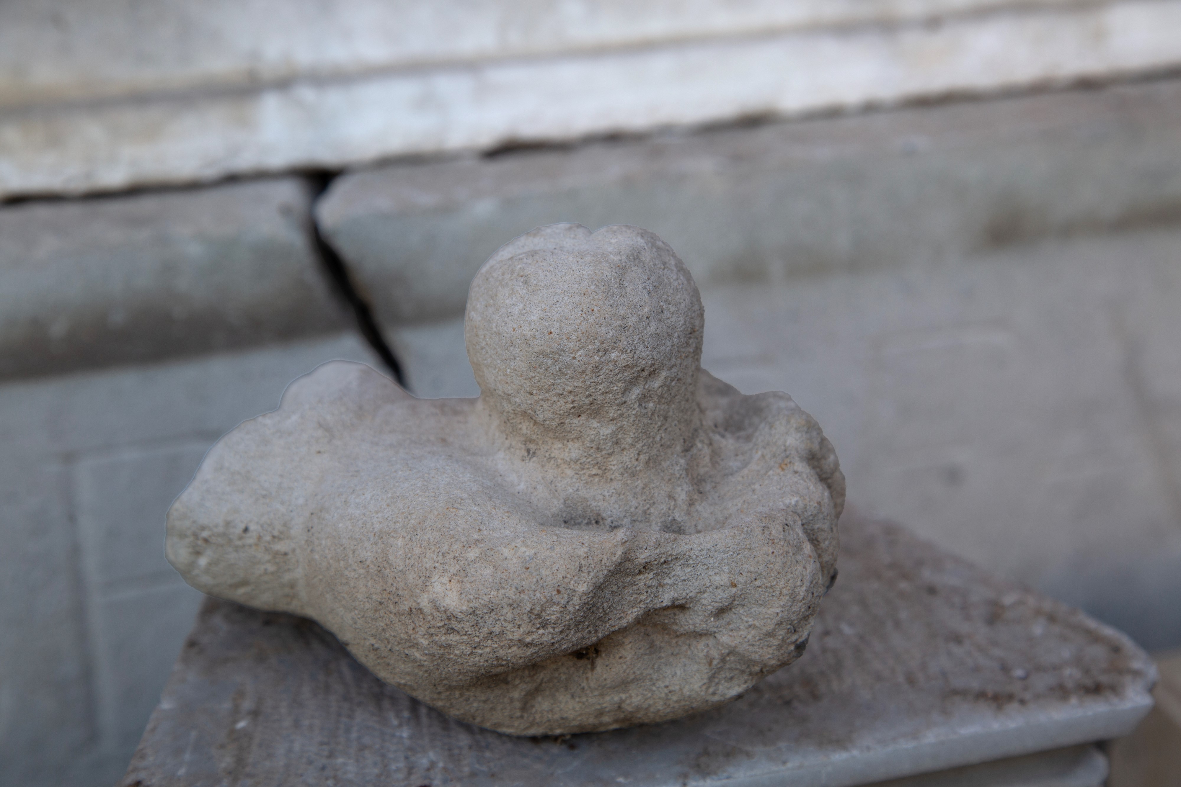 Frammento di mano reggente sfera in pietra. Difetti e mancanze.