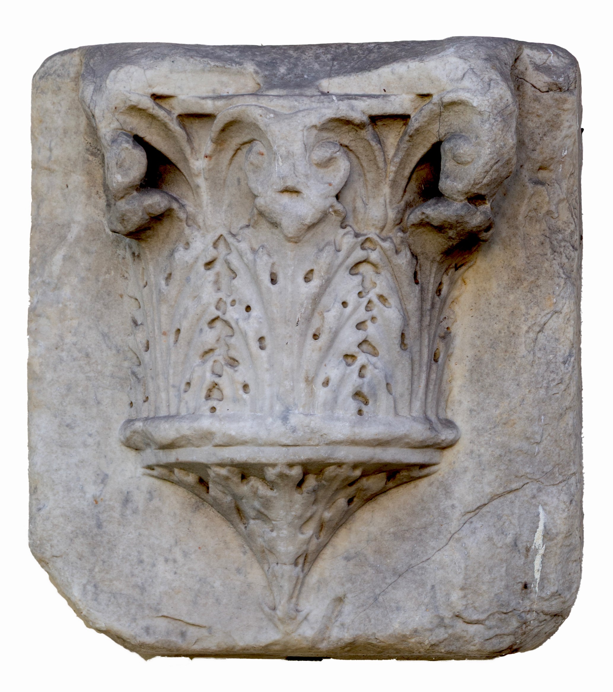 Frammento in marmo con capitello scolpito. Difetti e mancanze.
