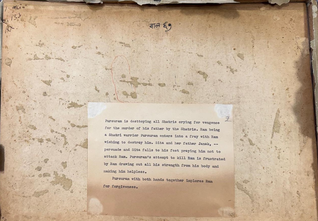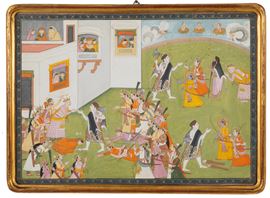 SCUOLA PAHARI, KANGRA DEL XIX SECOLO. Gouache su carta di riso raffigurante "SCENA DAL RAMAYANA". India. In cornice. Corredato di attestato di libera circolazione.