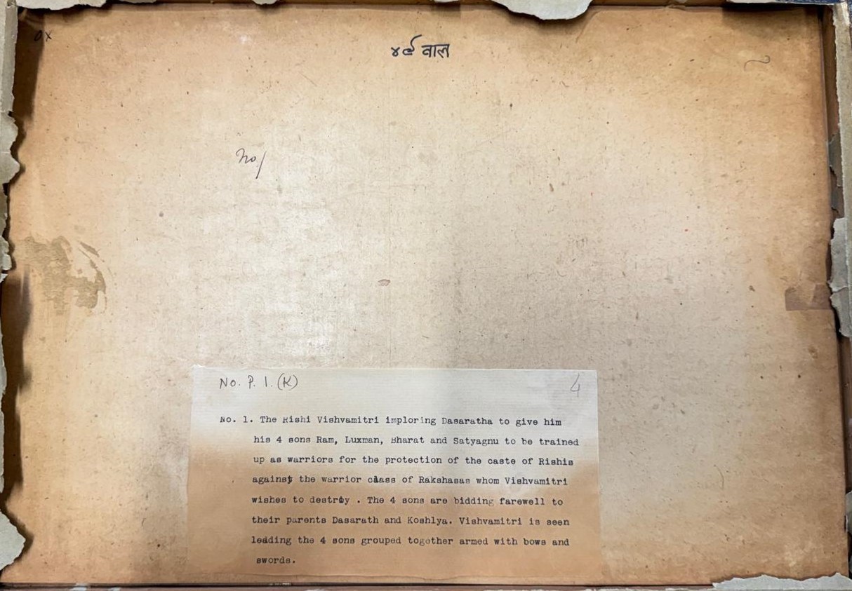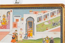 SCUOLA PAHARI, KANGRA DEL XIX SECOLO. Gouache su carta di riso raffigurante "SCENA DAL RAMAYANA". India. In cornice. Corredato di attestato di libera circolazione.