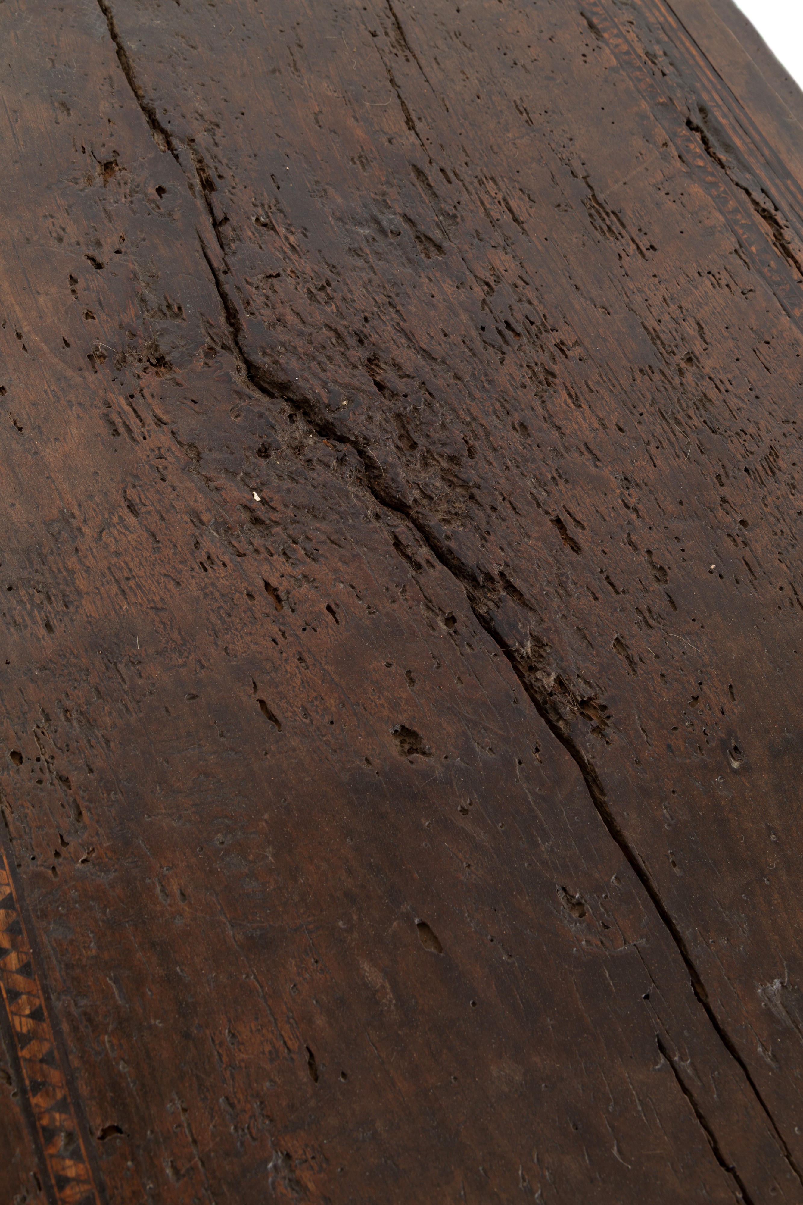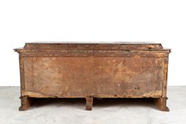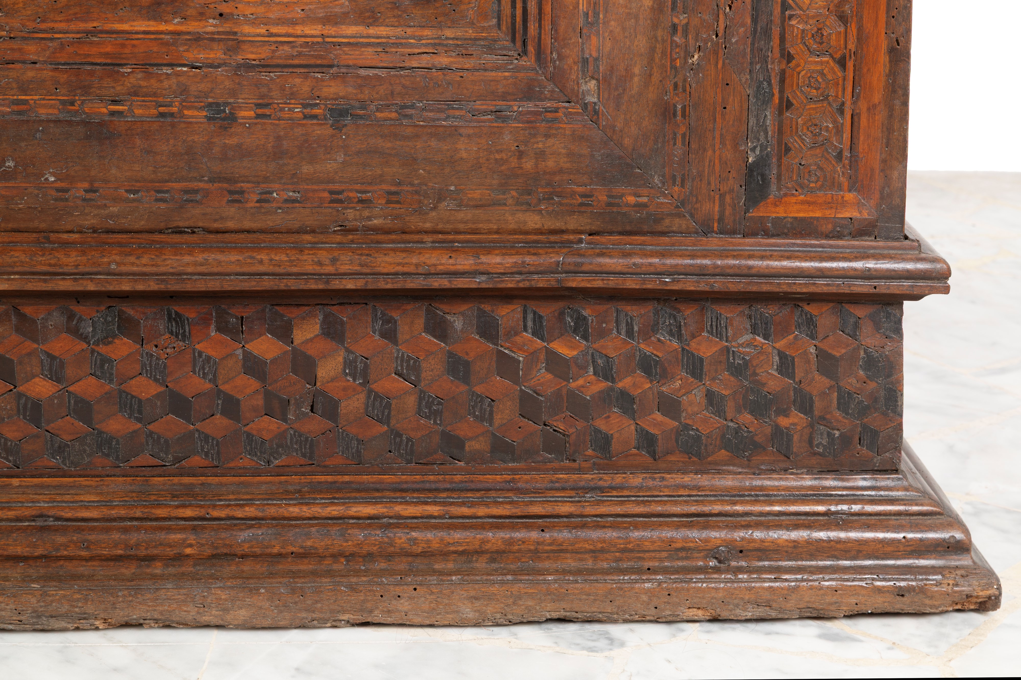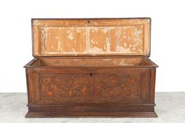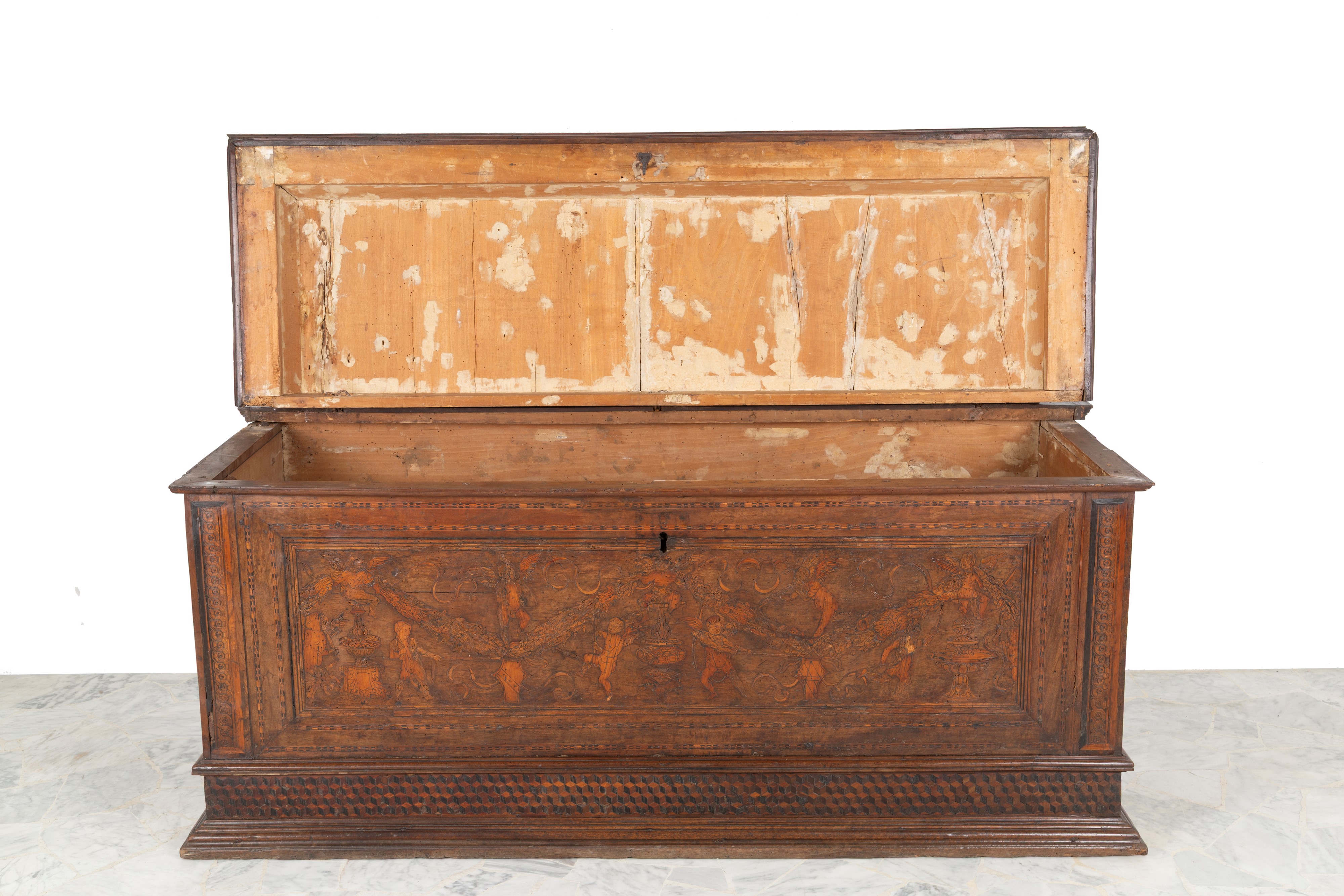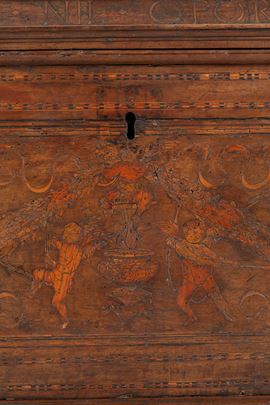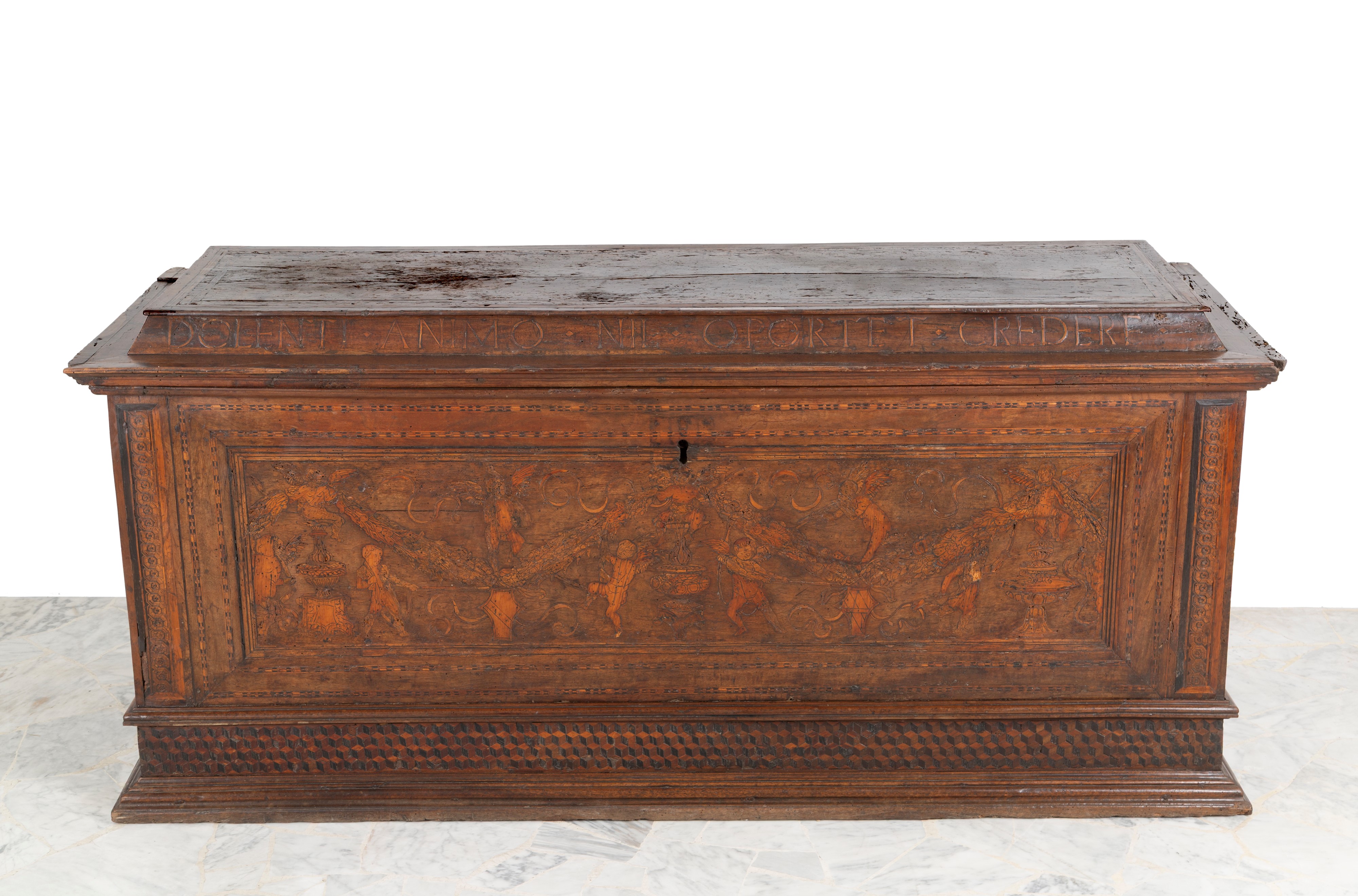 MAESTRO EBANISTA TOSCANO DI FINE XV SECOLO. Grande cassone nuziale in noce intarsiato con putti, ghirlande e stemmi nobiliari. Coperchio a sarcofago recante motto 'Dolenti animo nil oportet credere'. Difetti.
