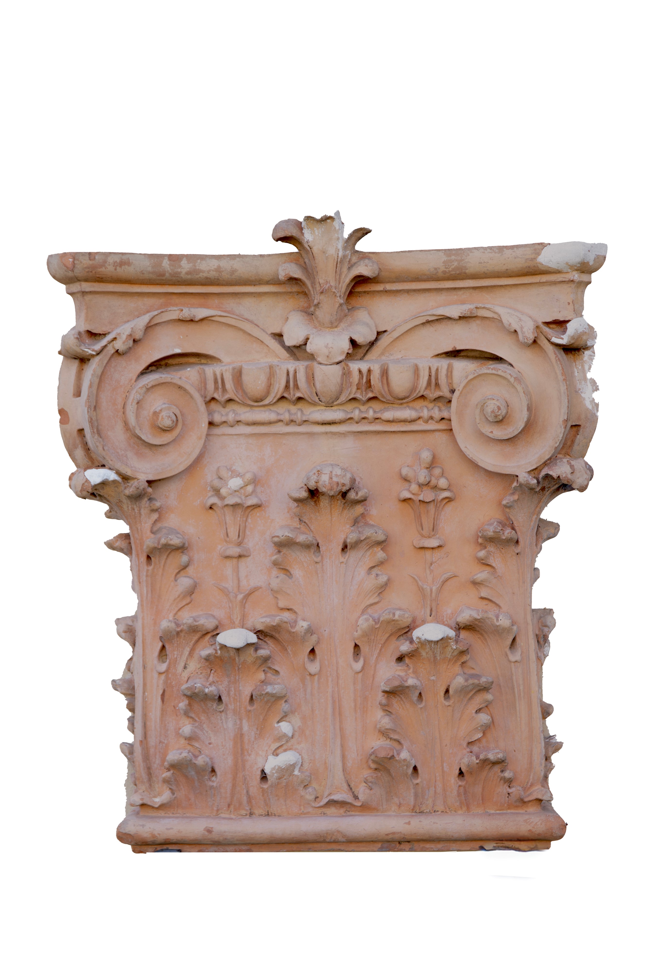 Grande formella a forma di capitello in terracotta. Difetti e mancanze.