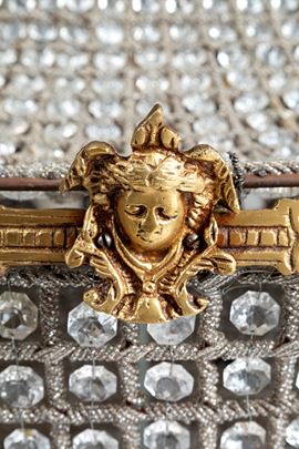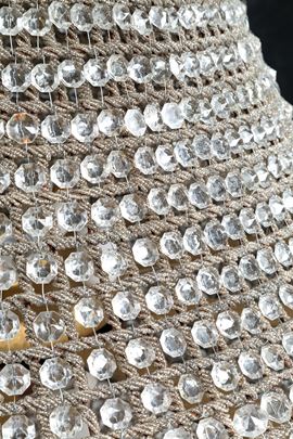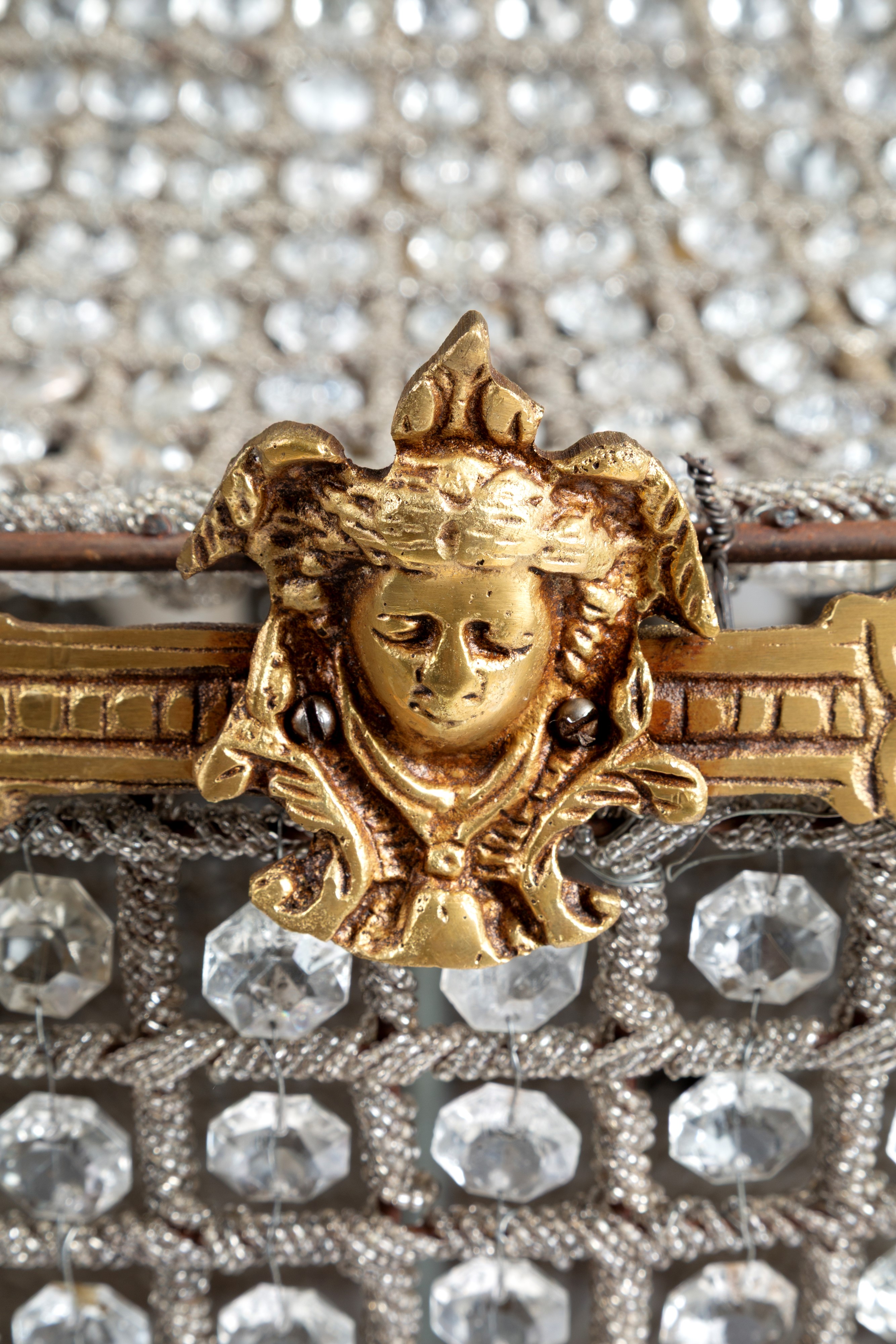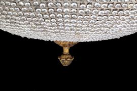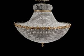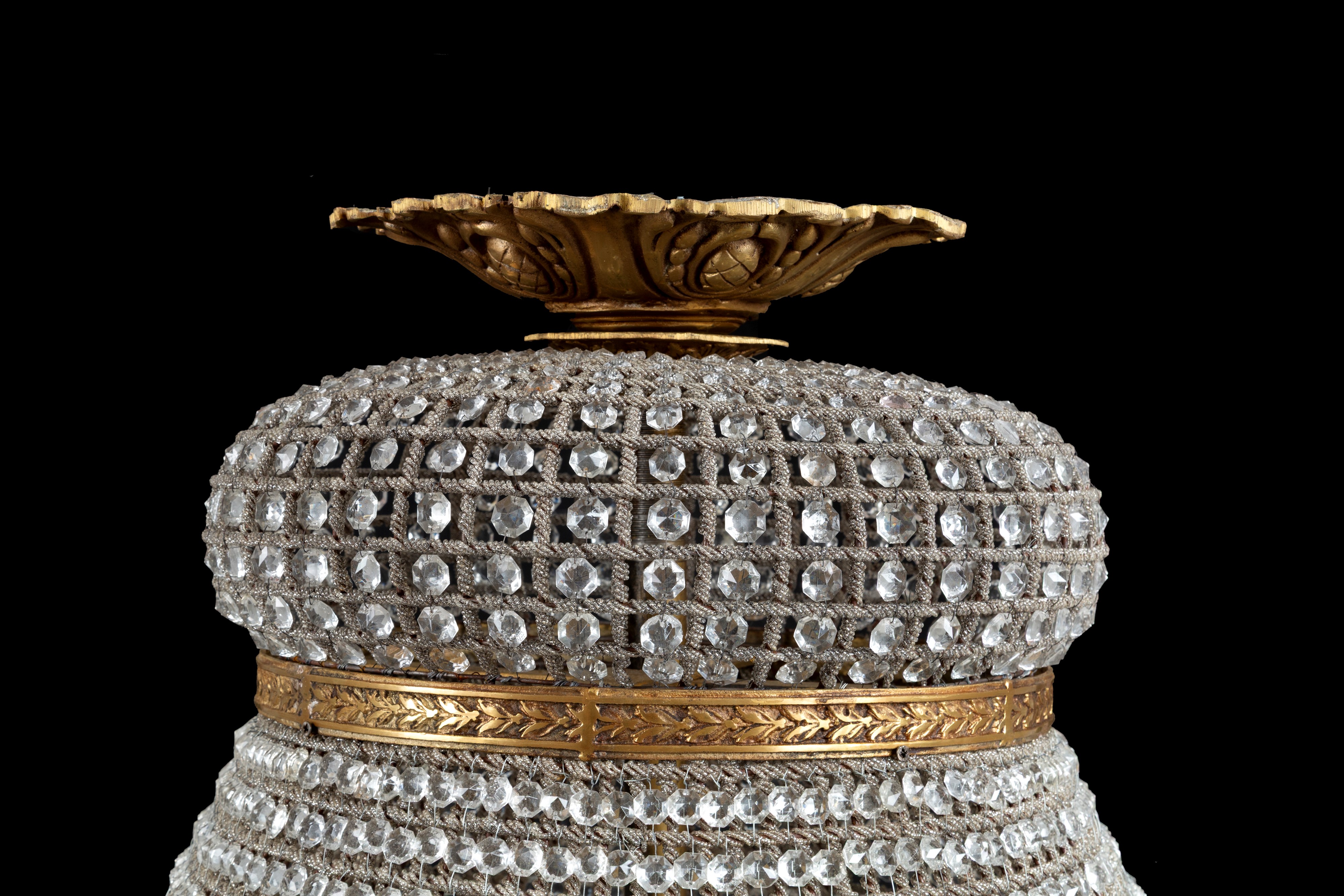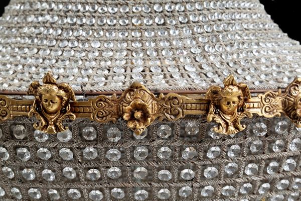 Grande lampadario sedici luci in bronzo dorato e perline in vetro. XX secolo.