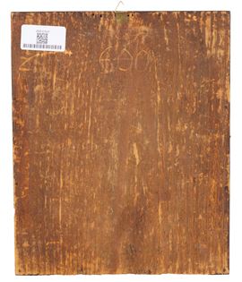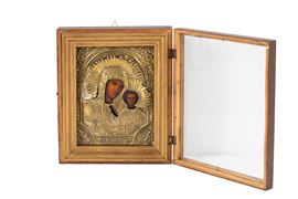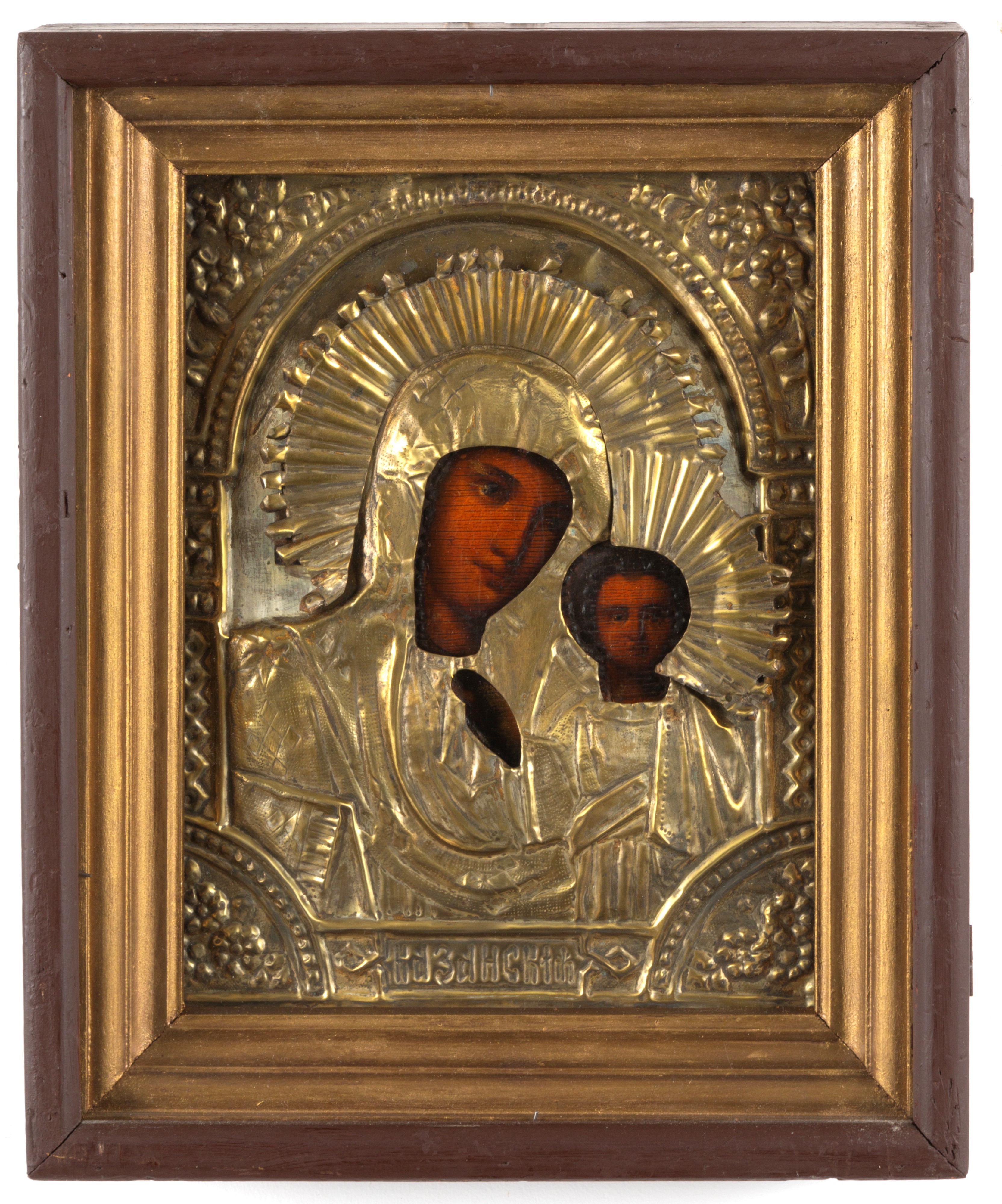 Icona con riza in ottone argentato raffigurante "MADONNA DI KAZAN". Russia. XIX secolo. In teca.