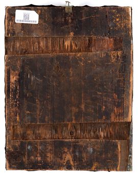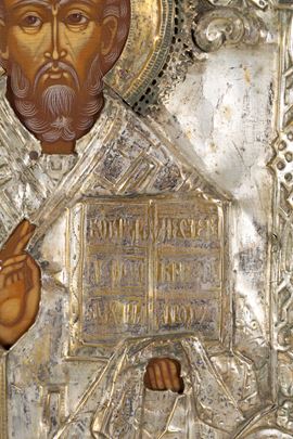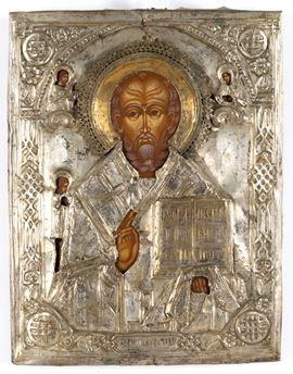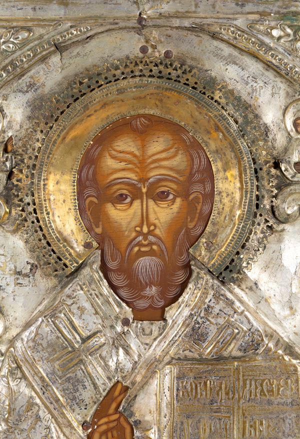 Icona con riza in ottone argentato raffigurante "SAN NICOLA TAUMATURGO". Russia. Fine XIX secolo.