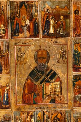 Icona raffigurante "SAN NICOLA TAUMATURGO CON SCENE DI VITA". Russia. Fine XVIII - inizi XIX secolo.